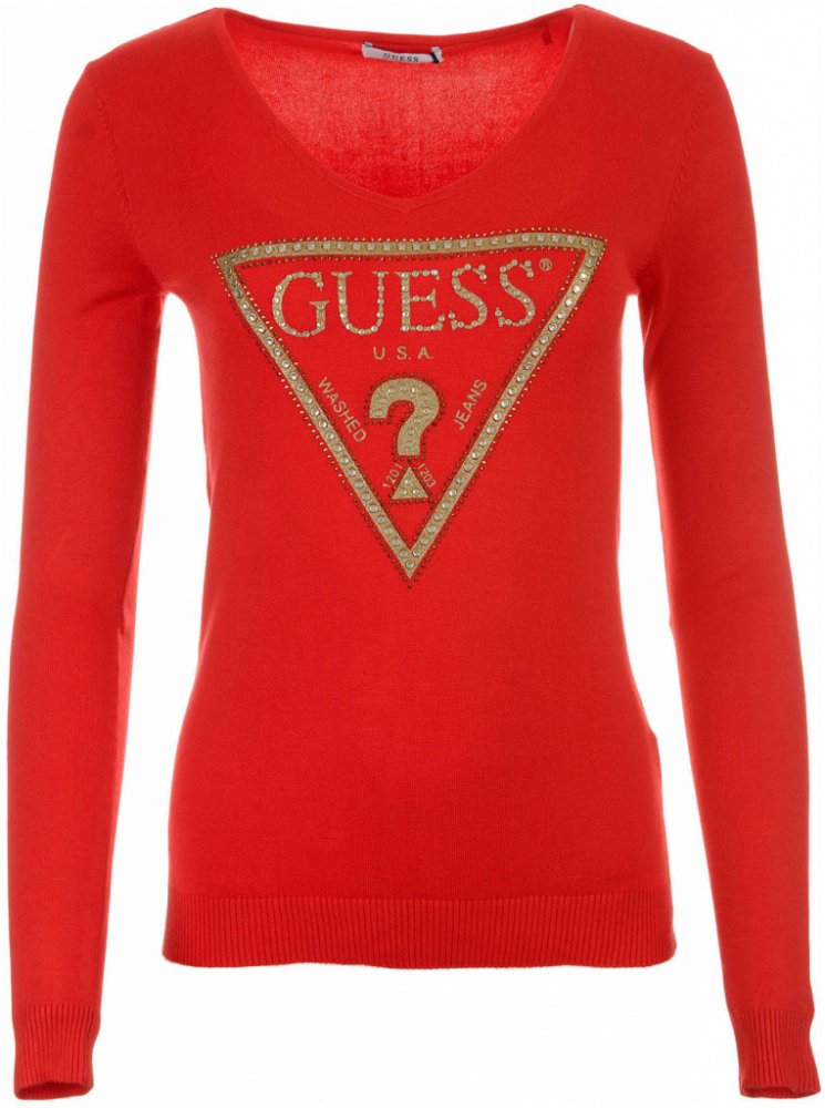 Dámský svetřík v syté červené barvě. Na přední straně je velké trojúhelníkové logo Guess ze zlatého potisku a zlatých a bílých kamínků .Svetr s dlouhými úzkými rukávy. Hlubší výstřih ve tvaru V je lemovaný úzkým žebrovaným úpletem. Hloubka výstřihu je cca 16 cm. Spodní okraj a lemy rukávů jsou zakončené širokým pružným žebrováním.Svetr rovného užšího střihu. Díky pružnému materiálu se dobře přizpů...