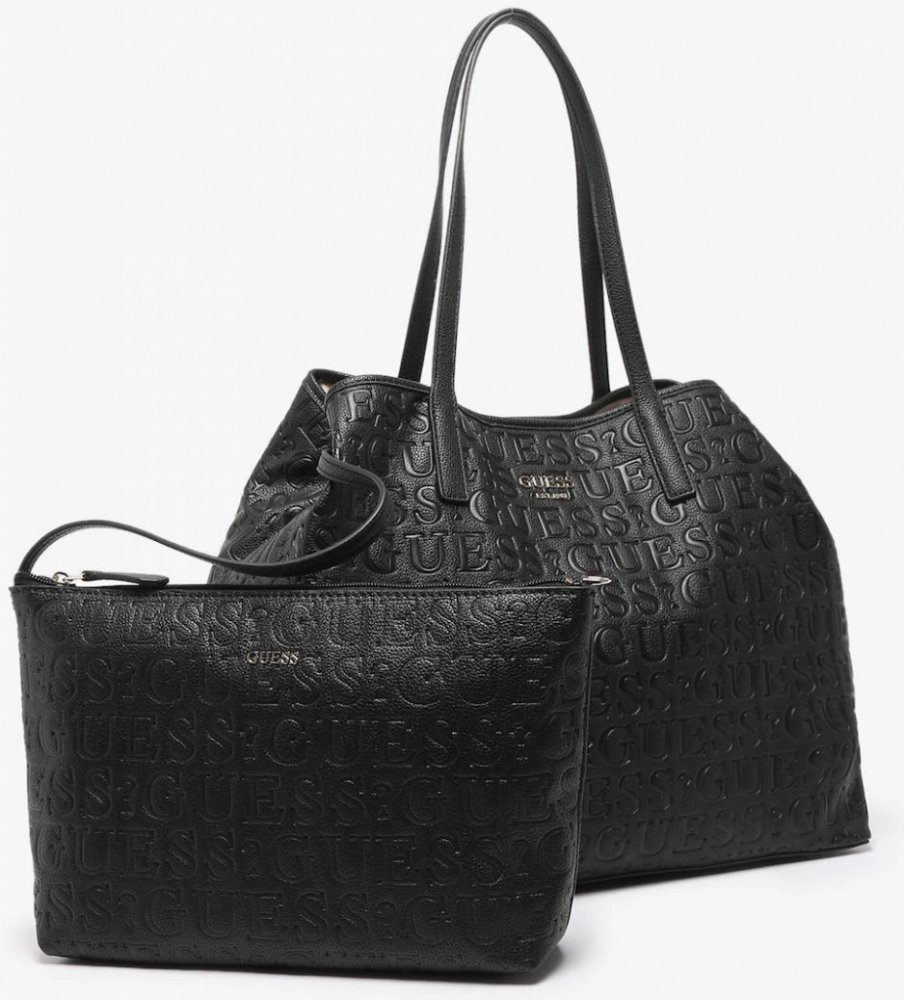 Stylová černá kabelka značky Guess je zdobená vytlačeným logem této luxusní značky. Kabelka má jednu prostornou komoru a uvnitř malou kabelku na zip do které můžeme dát všechny drobné věci a třeba i doklady. Elegantní design se hodí k různým outfitům, ať už na každodenní nošení nebo speciální příležitosti. Ideální doplněk pro moderní ženu.