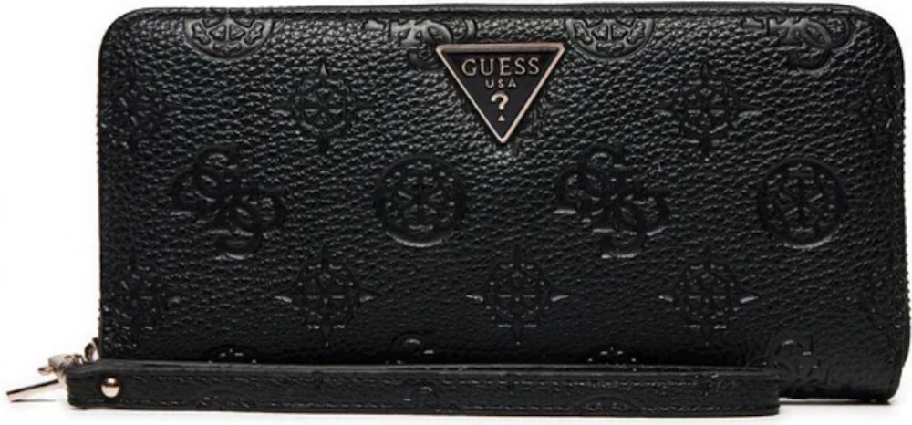 Černá dámská peněženka značky GUESS. Stylový hladký design s logem značky, kovovým trojúhelníkovým logem na přední straně a odnímatelným poutkem. Vnitřní uspořádání nabízí přihrádky na karty, prostor na bankovky a kapsu na mince se zapínáním na zip. Na zadní straně peněženky malá kapsička na zip. Celkové zapínání peněženky na zip. Elegantní a praktický doplněk pro každý den.