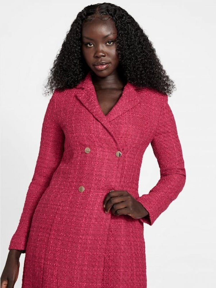 Dámský trendy kabát Guess v krásné malinově růžové barvě. Se 2-mi bočními kapsami, zdobené zlatými knoflíky s vyrytým logem. Kabát je projmutý, podšitý lesklou podšívkou. Vhodný na podzimní nebo jarní počasí, není vyteplený.
