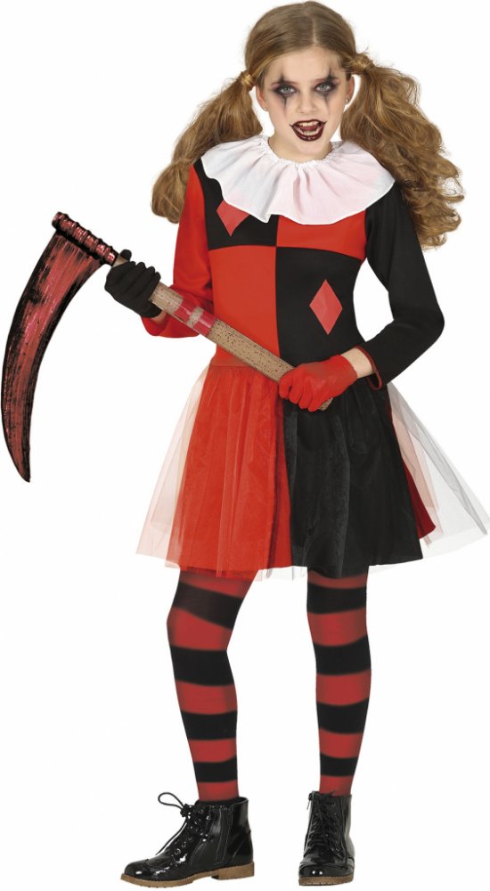 Černočervené šaty rebelky Harley Quinn s bílým límcem. Kosa ani punčochy nejsou součástí kostýmu.