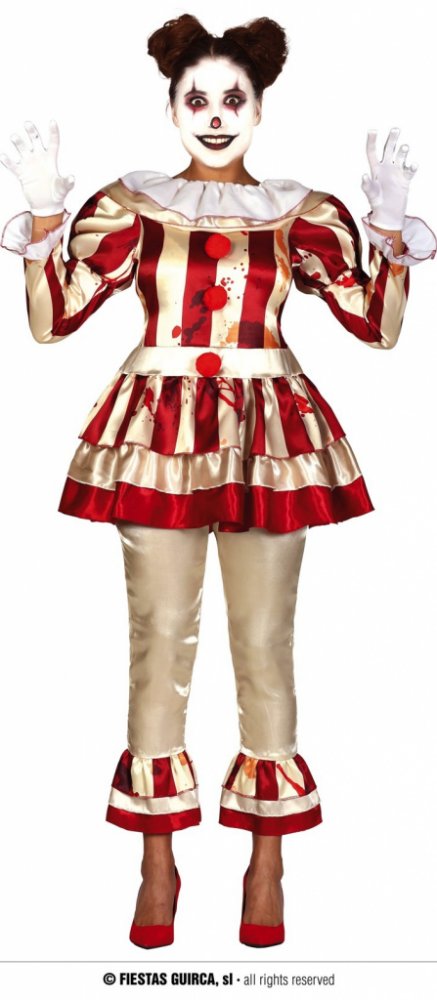 Triko s límcem potřísněné imitací krve  a tříčtvrteční kalhoty v béžové a červené barvě.