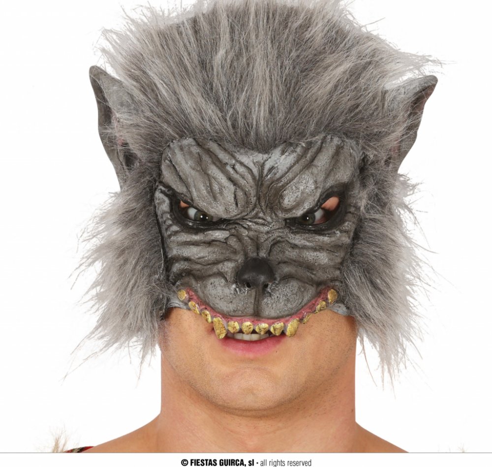 Vinylová karnevalová maska tylu vlkodlaka s vlasy. Ideální doplněk k pánskému halloweenskému kostýmu. Univerzální velikost.
