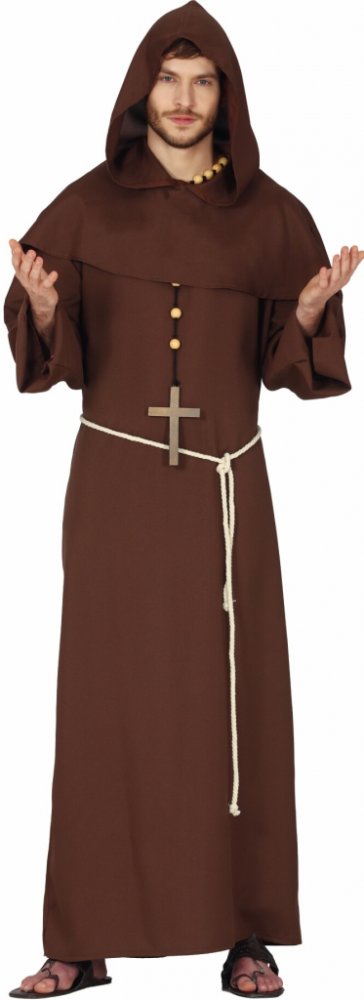 Autentický design a kompletní vzhled Srdcem kostýmu je dlouhý, volně střižený tmavě hnědý plášť (kutna) s integrovanou, hlubokou špičatou kapucí, která dodává postavě na tajemnosti. Široké rukávy a délka sahající až k zemi podtrhují tradiční střih. Součástí je také jednoduchá vnitřní tunika a krémově bílý pletený provazový pásek, který se jednoduše uváže kolem pasu a dotváří tak celkový autentický vzhled.