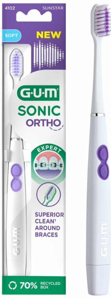GUM® SONIC ORTHO je bateriový sonický kartáček, který byl speciálně navržen pro osoby s rovnátky. Díky precizní konstrukci vláken a jemným sonickým vibracím čistí tam, kam se manuální ortodontický kartáček nedostane, takže je vaše péče o ústní dutinu účinná a efektivní.