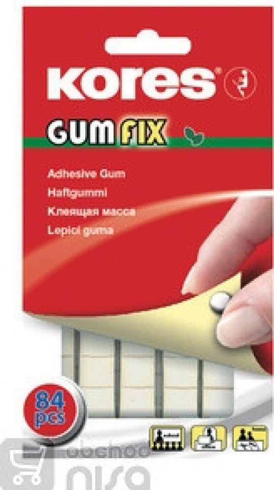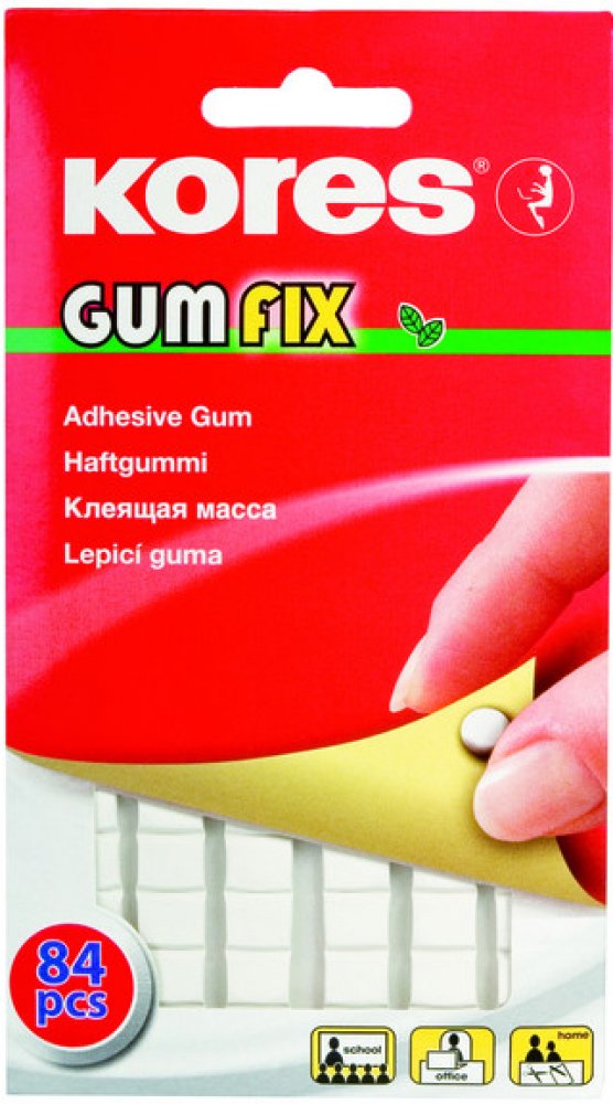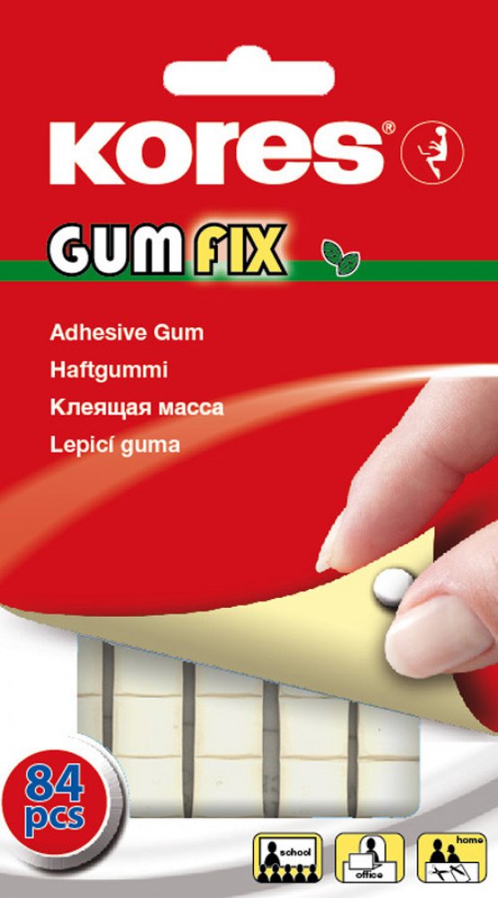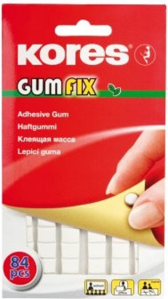 Bílá lepící guma Kores. Nezanechává stopy a je znovu použitelná. Široké použití. Vhodné na hladké plochy, tapety, malované plochy, sklo, kov, atd. Lepí: plakáty, vzkazy, zprávy, dekorace na večírky, razítkové podušky, telefony, poznámky, kalendáře, mapy, atd.