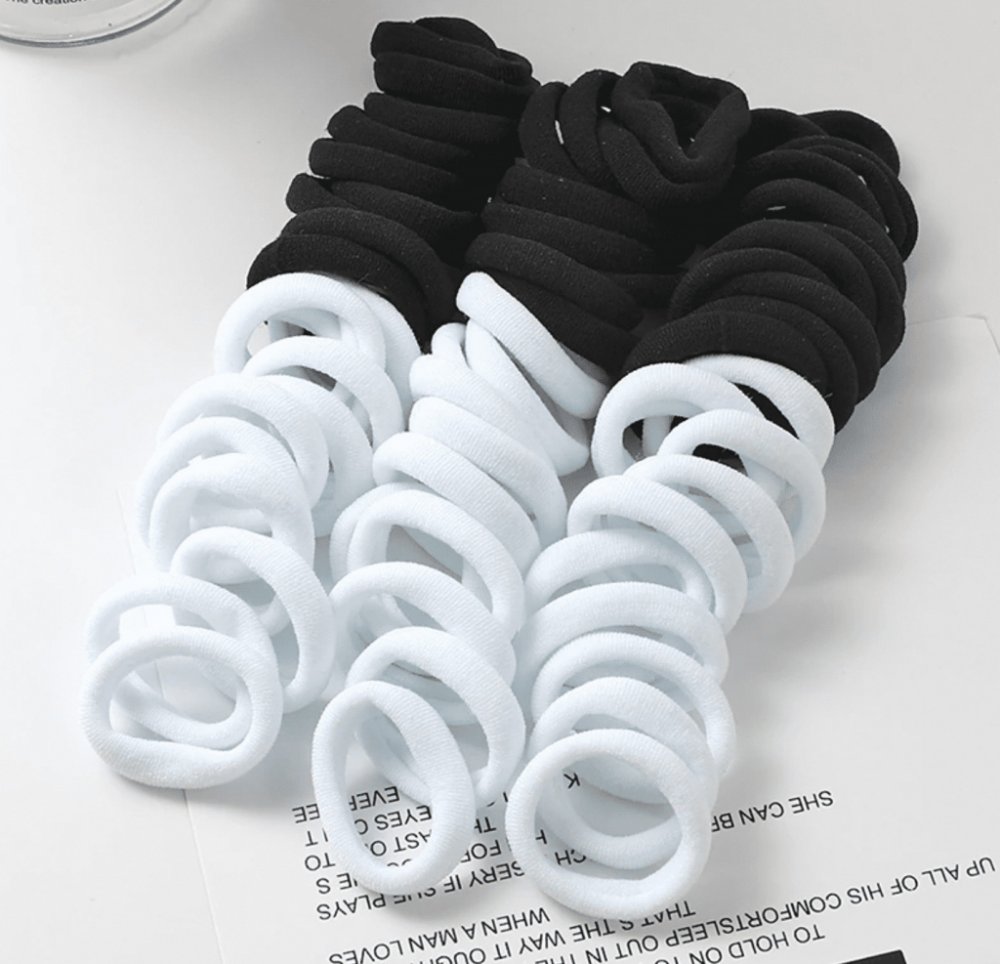 Sada černých a bílých gumiček do vlasů , které jsou velmi pružné, nezamotávají se do vlasů, vypadají skvěle a díky pevnosti perfektně drží. Snadno je zkombinujete s dalšími vlasovými ozdobami.