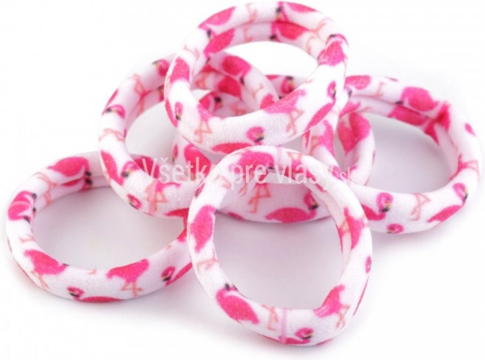 Romantické gumičky do vlasů s obrázkem plameňáka jsou k vlasům šetrné. Výborně drží, jsou vhodné pro jemné i husté vlasy.Vnitřní průměr volně položené gumičky je 3 cm, maximální délka obvodu po roztažení je 26 cm.