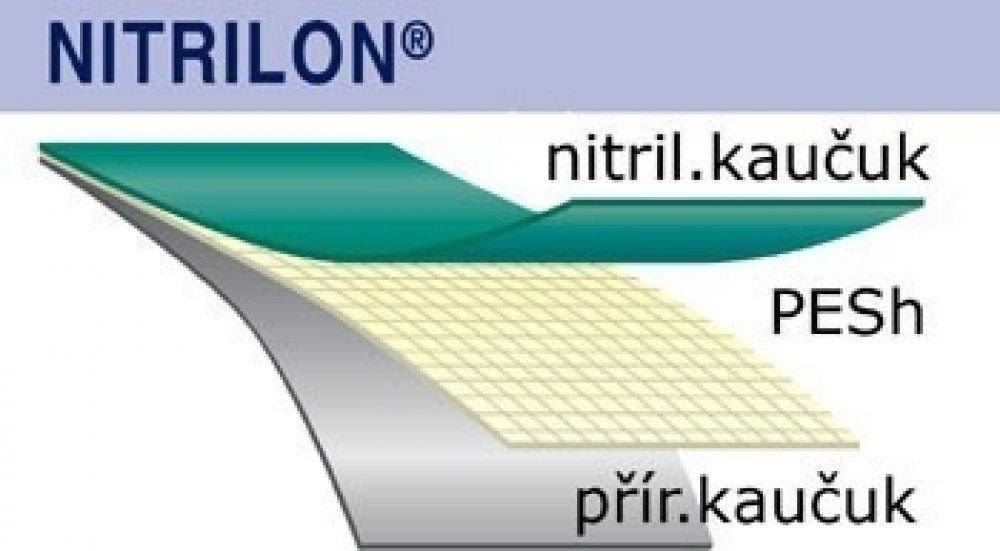 Tkanina Gumotex NITRILON je vysokopevnostní PES tkanina s oboustraným nánosem syntetického kaučuku. Nitrilon je vysoce odolný proti oděru, stárnutí a UV. Minimální pevnost v tlaku 3000/3000 N (vzorek 20x5cm).
