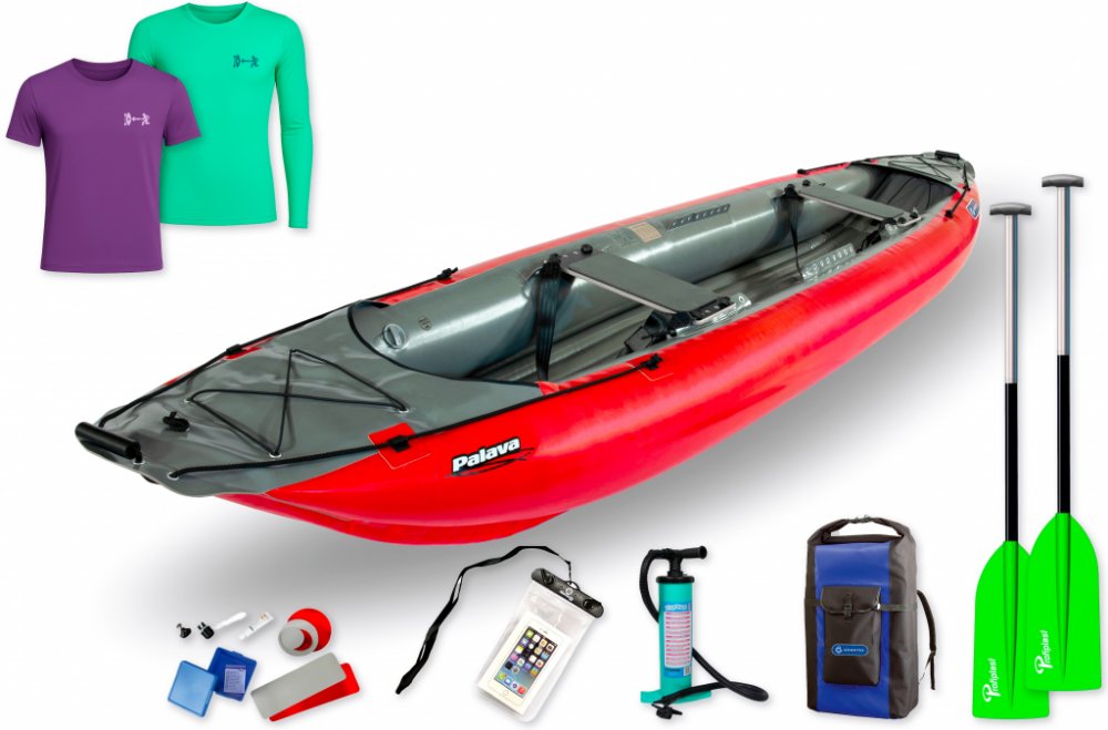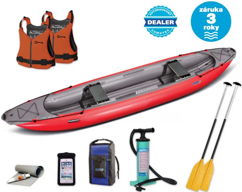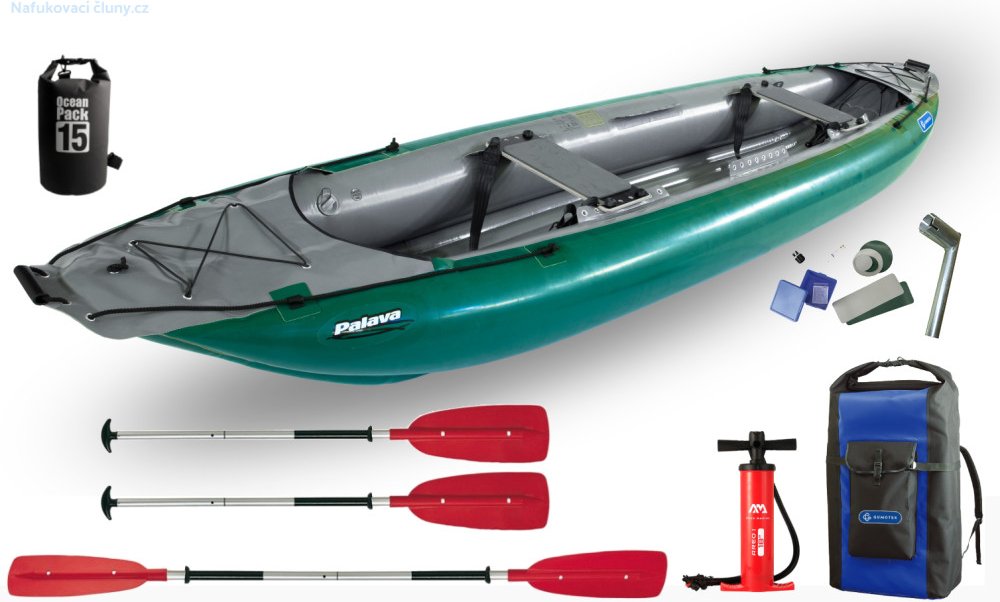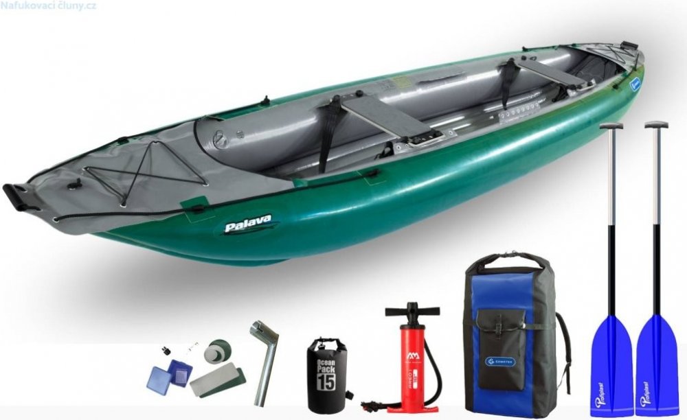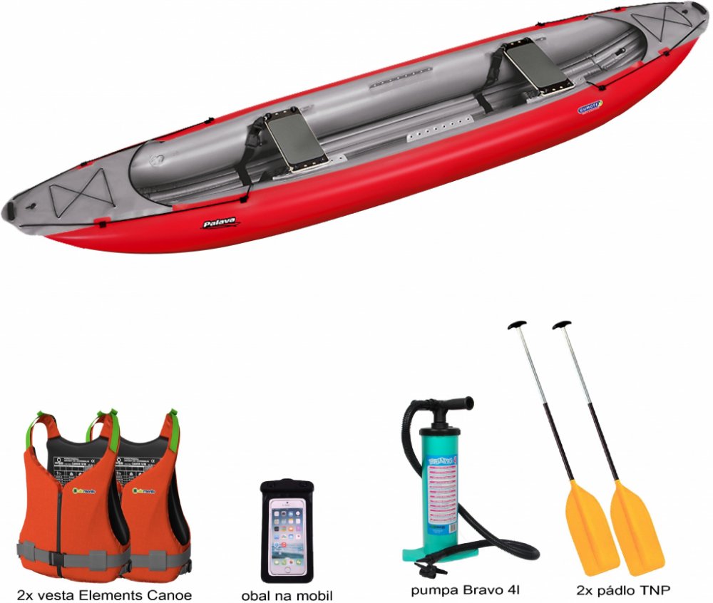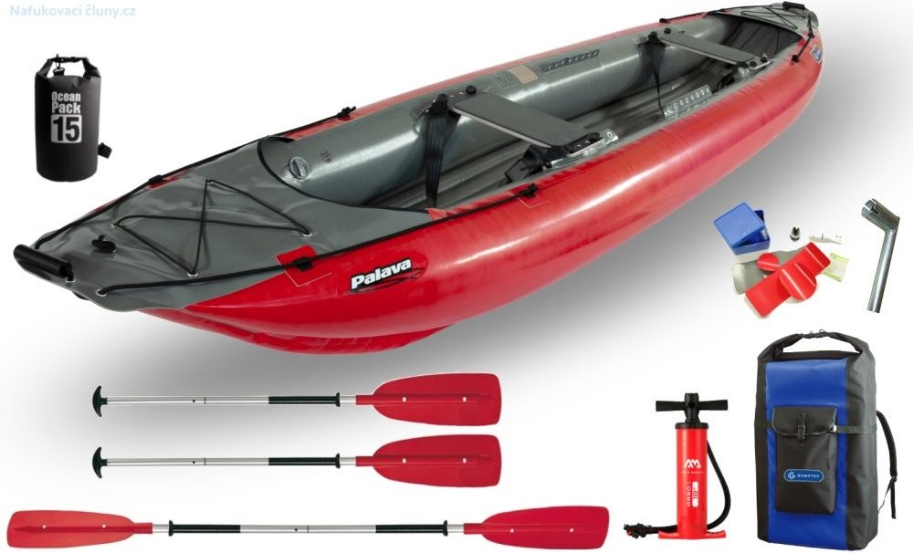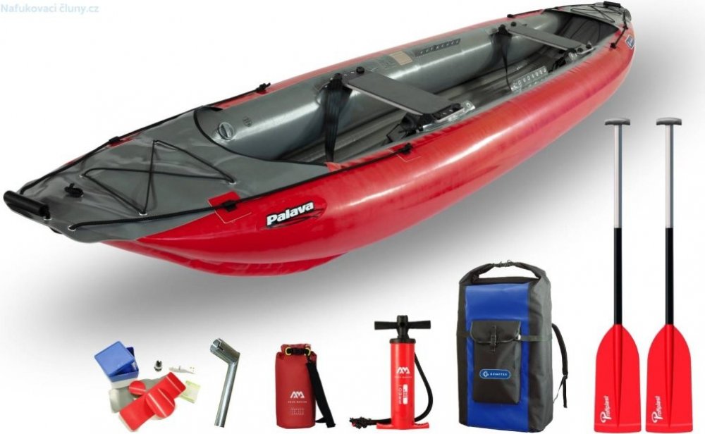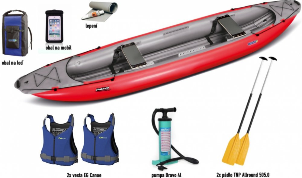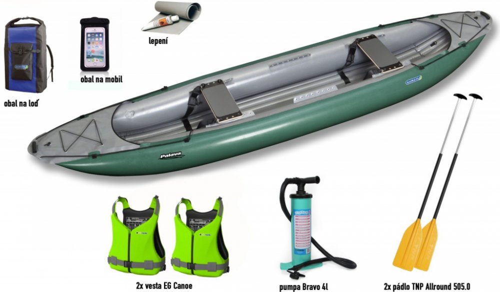 Kanoi Palava 400 GUMOTEX dodáváme ve vodotěsném vaku o objemu 100 l a včetně lepící soupravy a redukce na Push-push ventil. Ve vodotěsném vaku je možno Pálavu přenášet na zádech a během plavby v něm můžete uchovat všechny potřebnosti pěkně v suchu.