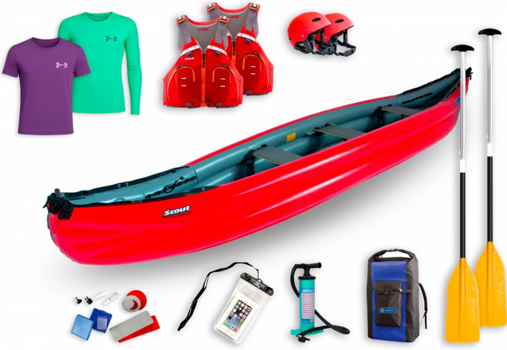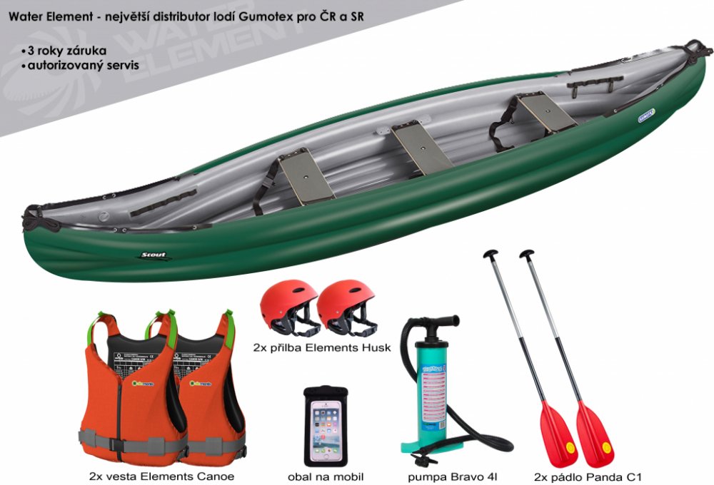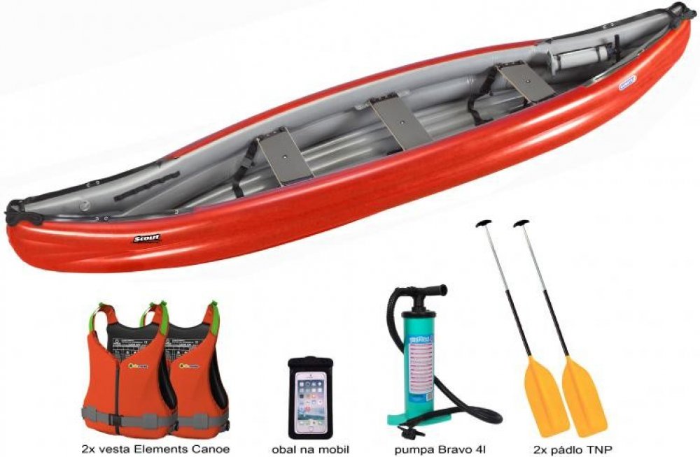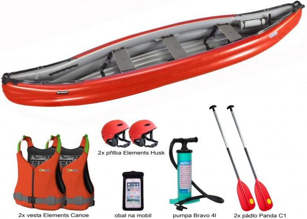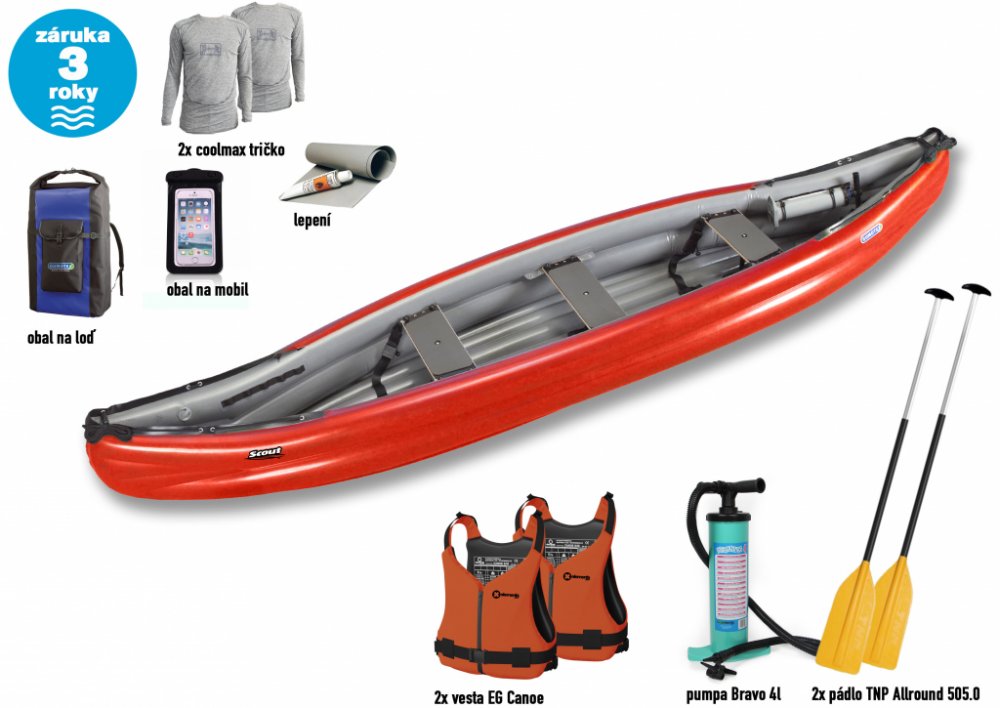 Gumotex Scout Standart speciální set. V ceně: kánoe Gumotex Scout Standart + 2x pádlo Panda C1 + 2x vesta EG Canoe + 2x přilba EG Husk + pumpa Bravo 4L + obal na mobil EG Flow + sada lepení + vodotěsný vak 135 L! Gumotex SCOUT standart je nafukovací kánoe tvarem připomínající klasické-laminátové nebo plastové kánoe, kde příď lodi rozráží vodu a snižuje tím odpor při plavbě. Scout standart SET s vy...
