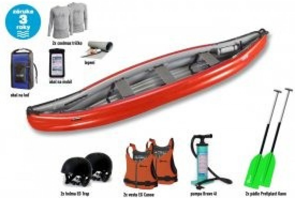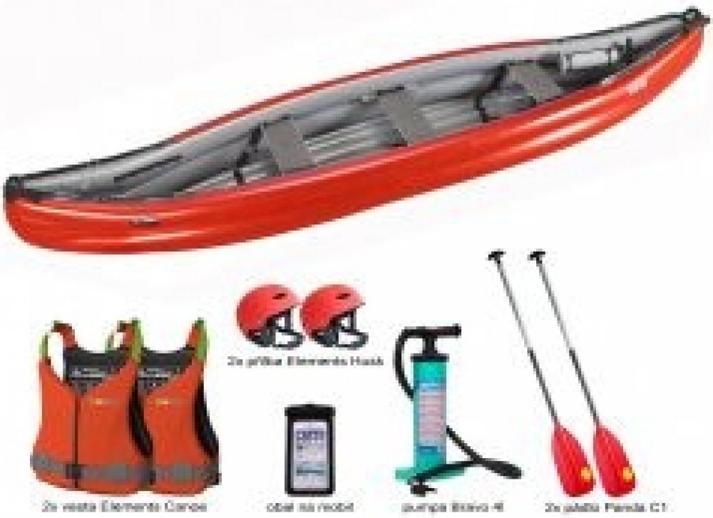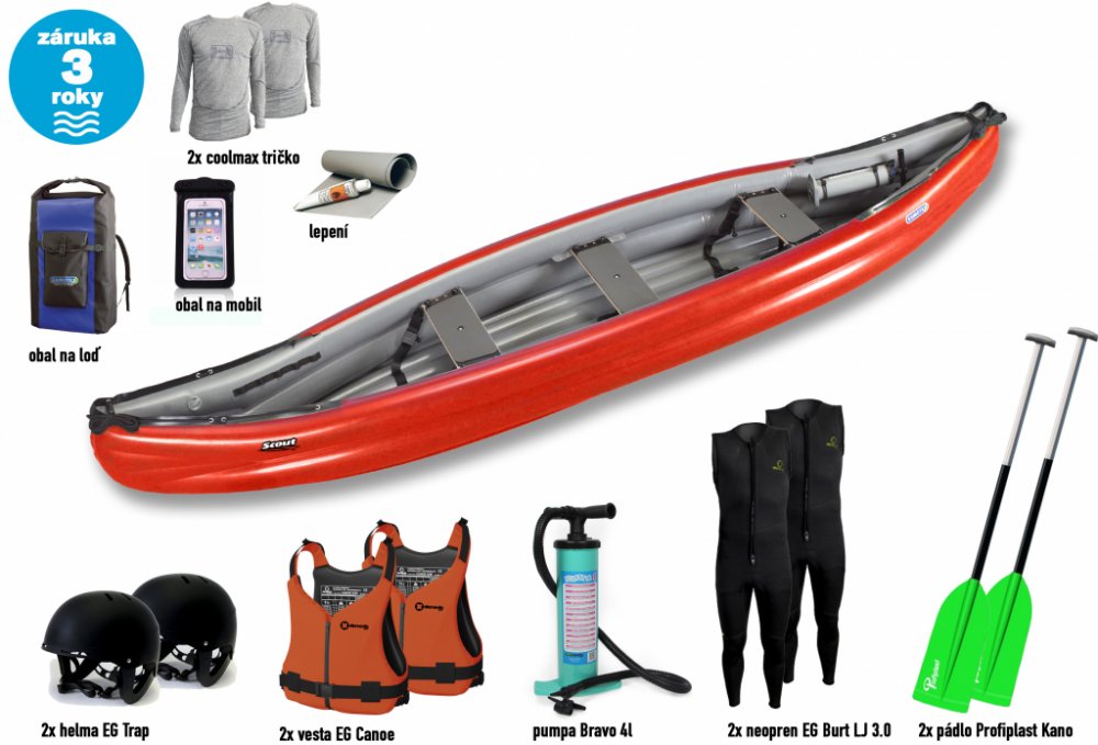 Gumotex Scout Standart speciální set. V ceně: kánoe Gumotex Scout Standart + 2x pádlo Panda C1 + 2x vesta EG Canoe + 2x přilba EG Husk + pumpa Bravo 4L + obal na mobil EG Flow + sada lepení + vodotěsný vak 135 L!!!