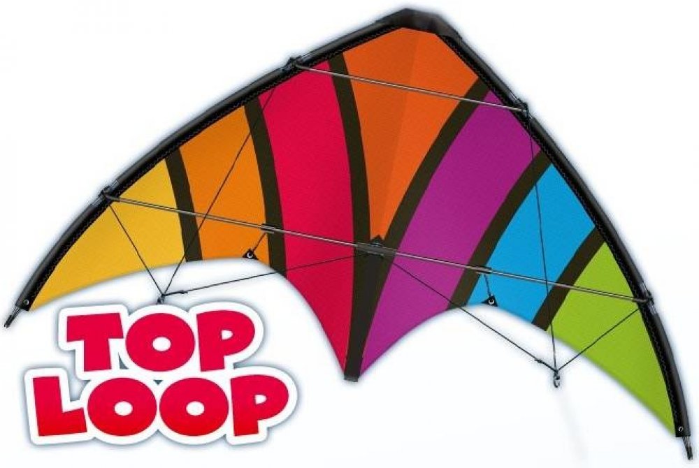 Létající drak řiditelný TOP LOOP, 130x69 cm Létající drak sportovní, akrobatický, řiditelný pro začátečníky má pevnou sklolaminátovou konstrukci a extra pevné švy. Létající drak TOP LOOP patří mezi oblíbené létající hračky a draky a je vhodný pro děti od 8 let.