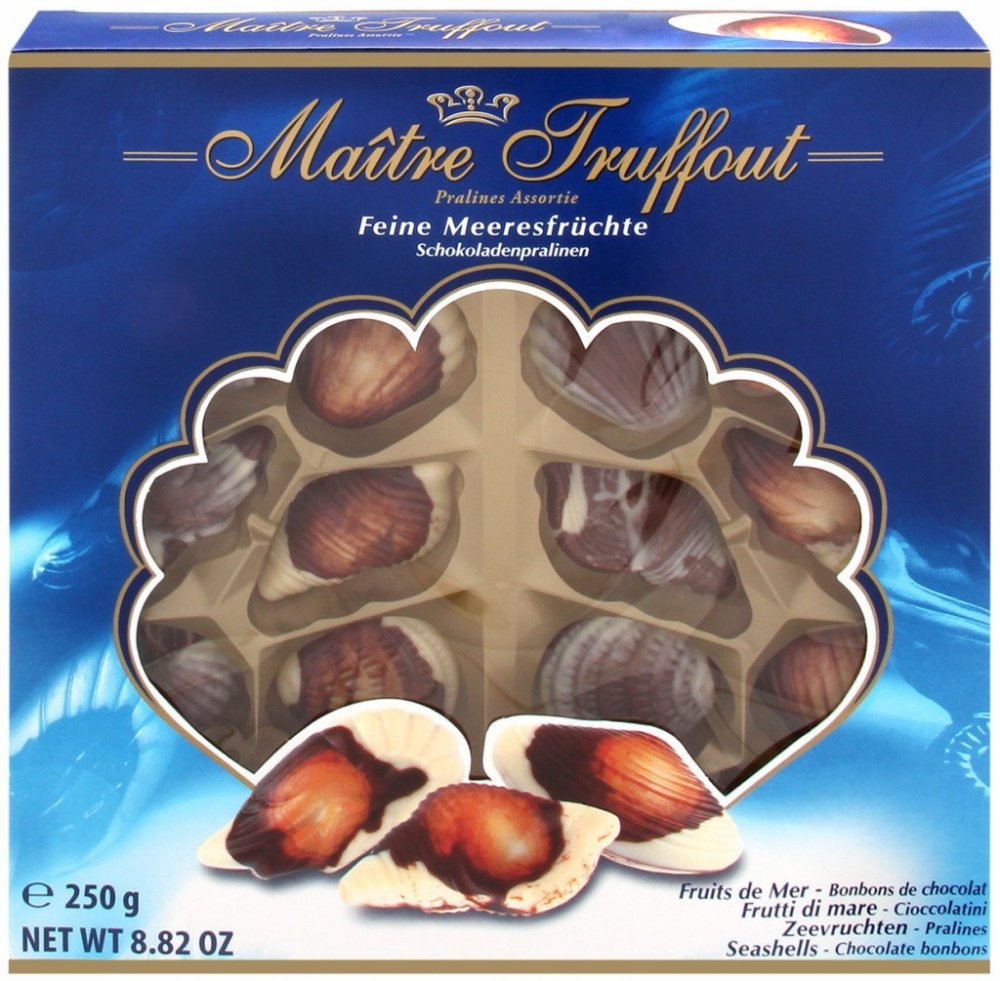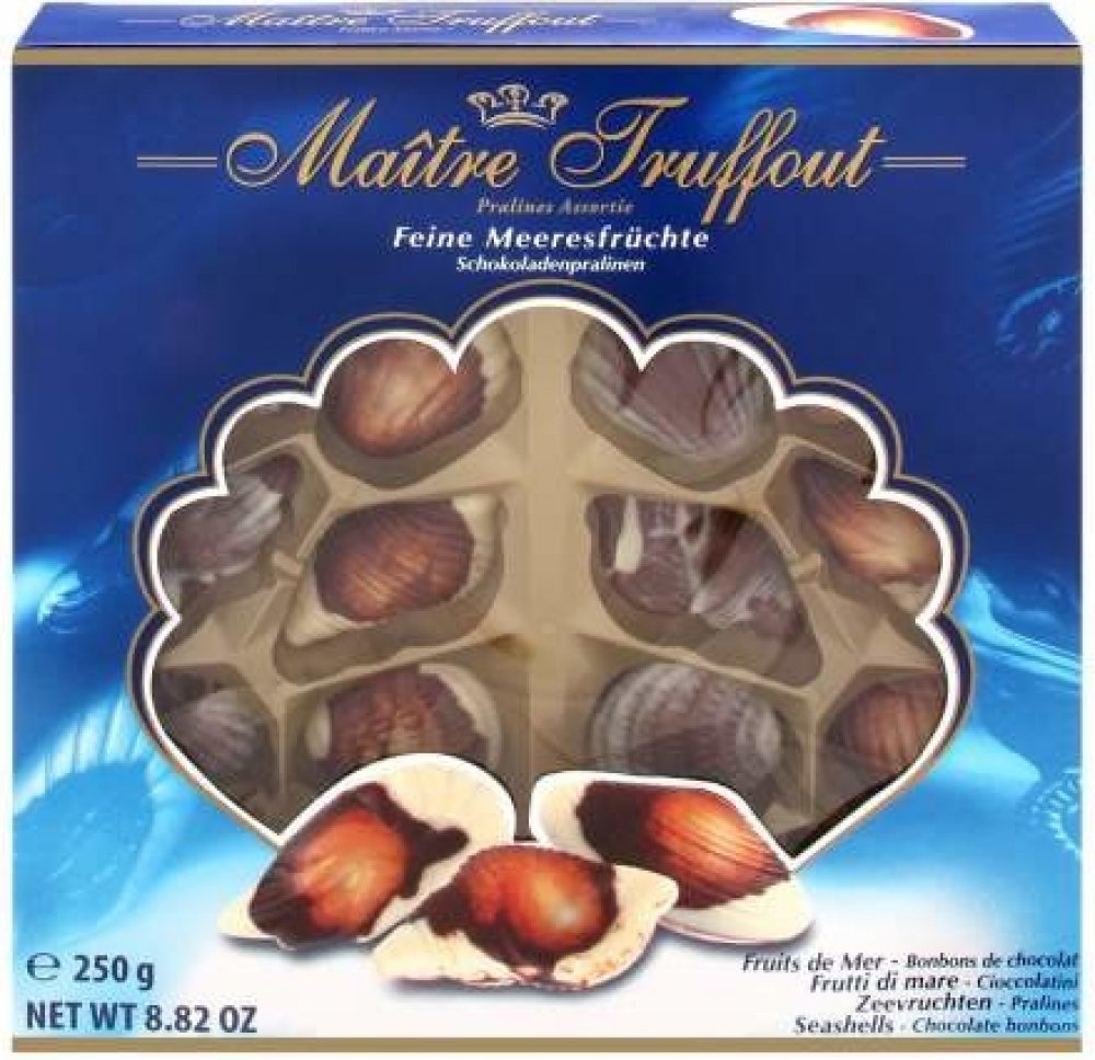 Maitre Trufout čokoládové pralinky ve tvaru mořských plodů vyrobené z jemné Belgické čokolády s náplní s vůní lískových oříšků 57%