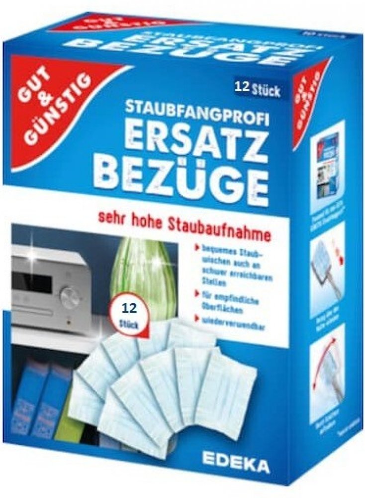 Gut & Günstig Magnetická prachovka - 12 náhradních prachovek - balení neobsahuje rukojeť. Gut & Günstig německá magnetická prachovka Vás spolehlivě zbaví nepříjemného prachu. Praktický a šikovný pomocník v domácnosti, ideální pro těžko přístupné plochy a citlivé povrchy. Velmi vysoká absorpce prachu - přitahuje a váže prach, takže se prach nevíří, k opakovanému použití.DOVOZ:NĚMECKO.ŽIVOTNÍ PROSTŘEDÍ:Zcela prázdný a důkladně čistý obal lze recyklovat. Třídění odpadu má smysl.VÝROBCE:EDEKA Zentrale Stiftung & Co. KGNew York Ring 6D-22297 HamburkTel: +49 0800 3335211E-mail: info@edeka.de