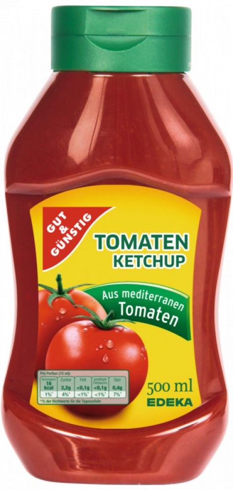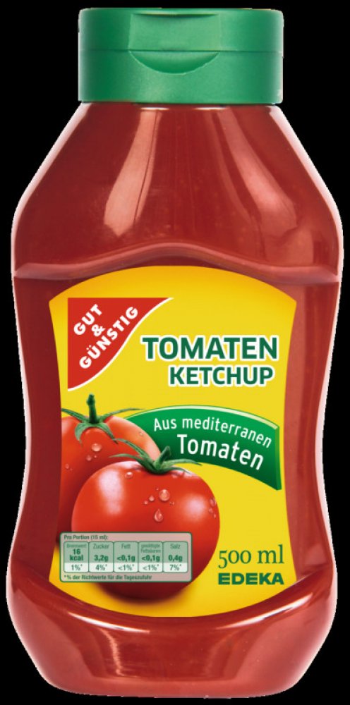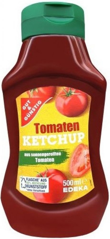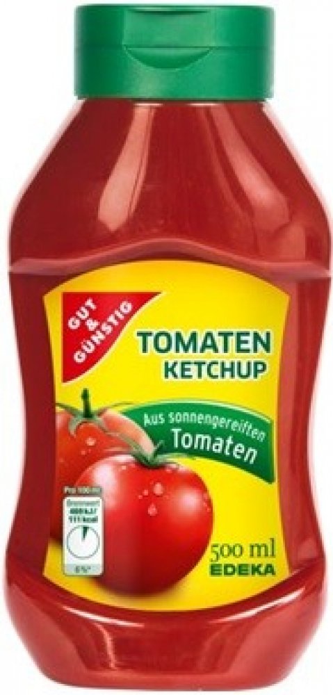 Vynikající, kvalitní kečup s vysokým podílem rajčat. Vyrobeno z na slunci vyzrálých rajčat. Obsah odpovídá zhruba 24 – 26 kusům čerstvých rajčat. Složení: Rajský protlak koncentrovaný 72%, cukr, ocet, sůl,koření, kyselina citrónová. Výživové údaje na 100g: Energetická hodnota: 469kcal/111kj Tuk: 0,2g (z toho 0,1g nasycené mastné kyseliny) Sacharidy: 23,2g(z toho 20,7g cukr), Bílkoviny: 1,7g, Sůl: 2,62g Minimální trvanlivost: uvedeno na víčku. Před otevřením protřepejte. Po otevření skladujte v ledničce a spotřebujte v průběhu 8 týdnů. Edeka Zentrale AG & Co. Kg, Hamburg.