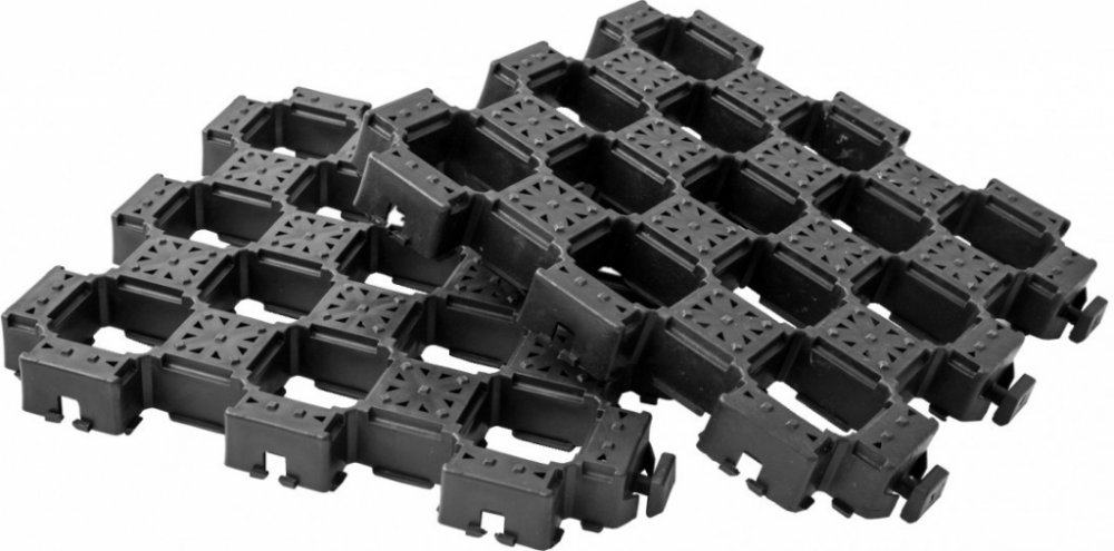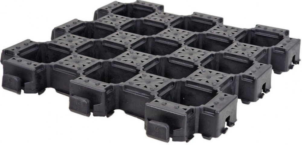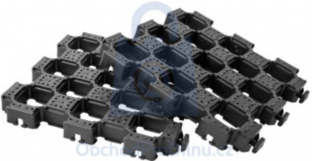 Zatravňovací tvárnice materiál polyethylen (PE/PP) rozměry 302 x 302 x 37 mm (bez připojovacích kolíků) spotřeba 10,964 ks/m2 nosnost 160 t/m2 hmotnost 550 g/ks recyklovatelné 100% barva černá