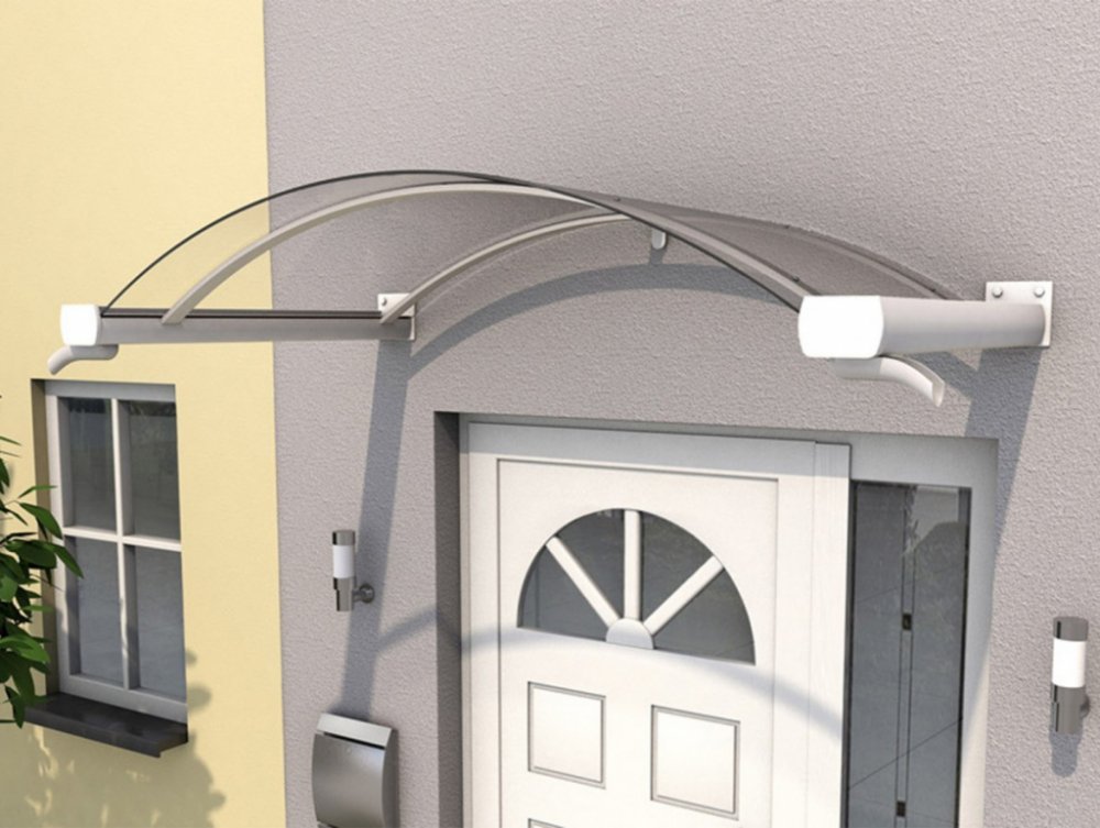 Vchodová stříška Guttavordach BV/B - Obloukové provedení stříšky nad vchodové dveře německé výroby z akrylového skla (PMMA) a hliníkového rámu se žlaby po obou koncích. Tloušťka zasklení 4 mm. Šířka vchodové stříšky ve variantě 160 a 200 cm. Zatížení až 75 kg/m2. Záruka 5 let.