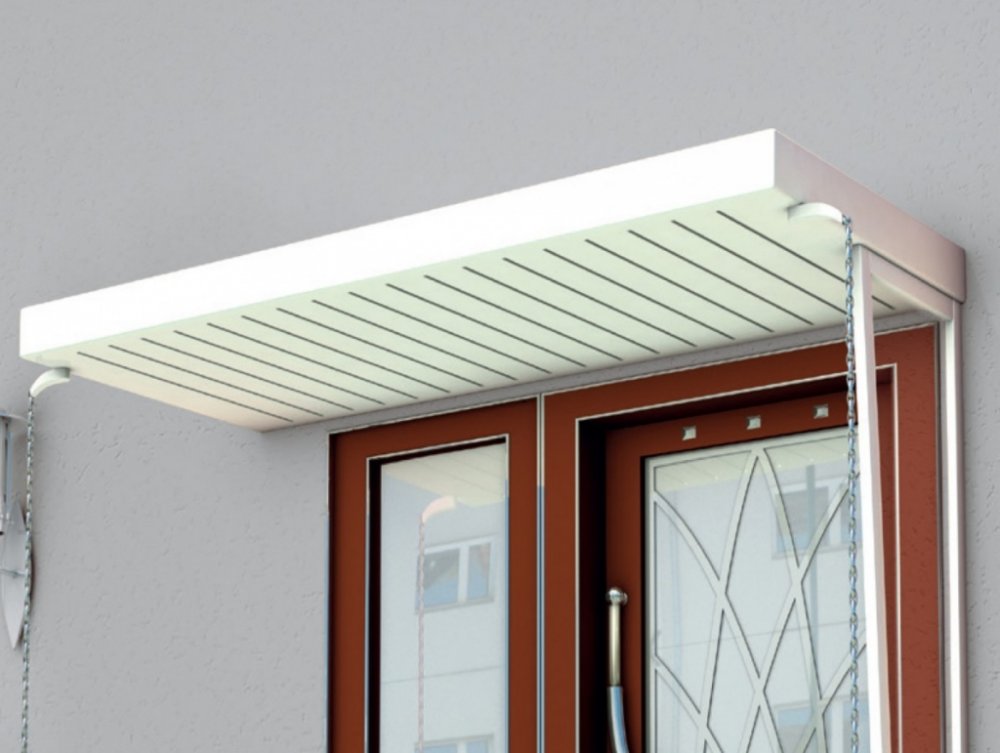 Stříška nad vchodové dveře Guttavordach NM je vyrobena z práškově barveného hliníku se zastřešením plastovým trapézem. Vestavěný okap se dvěma vývody na bocích stříšky. Vchodová stříška Guttavordach NM je vhodná pro zastřešení vchodů, balkonů, výloh obchodů nebo například pro zastřešení nad bankomaty. K tomuto typu stříšky je možné dodat boční stěnu (nejsou součástí balení). Testováno na zatížení sněhem 75 kg/m2.