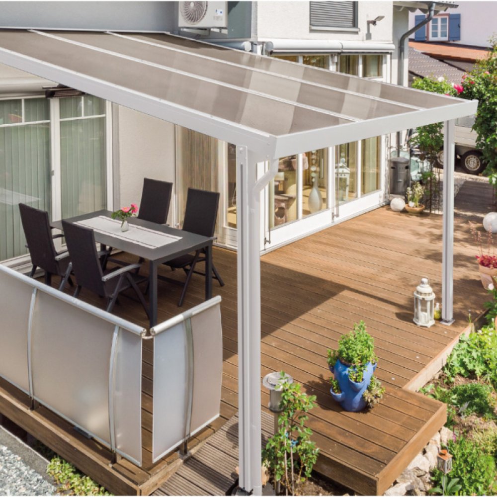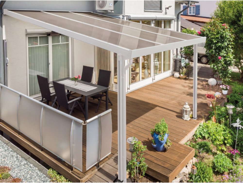 Hliníková pergola Terrassendach Premium - bronzový akryl / bílá konstrukce - Prémiová pergola Gutta v nejvyšší kvalitě s konstrukcí z dutých profilů opatřených nástřikem v bílé barvě. Dostupná v široké škále rozměrů.