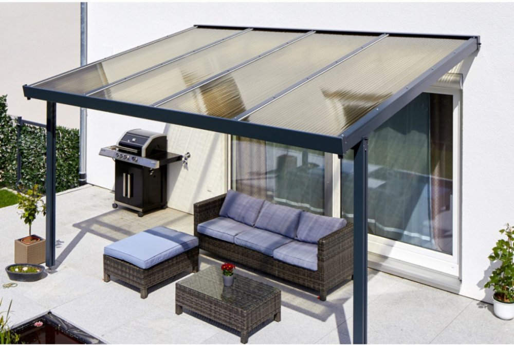 Hliníková pergola Terrassendach Premium - bronzový akryl / antracitová konstrukce - Prémiová pergola Gutta v nejvyšší kvalitě s konstrukcí z dutých profilů, opatřených nástřikem v antracitové barvě. Dostupná v široké škále rozměrů.