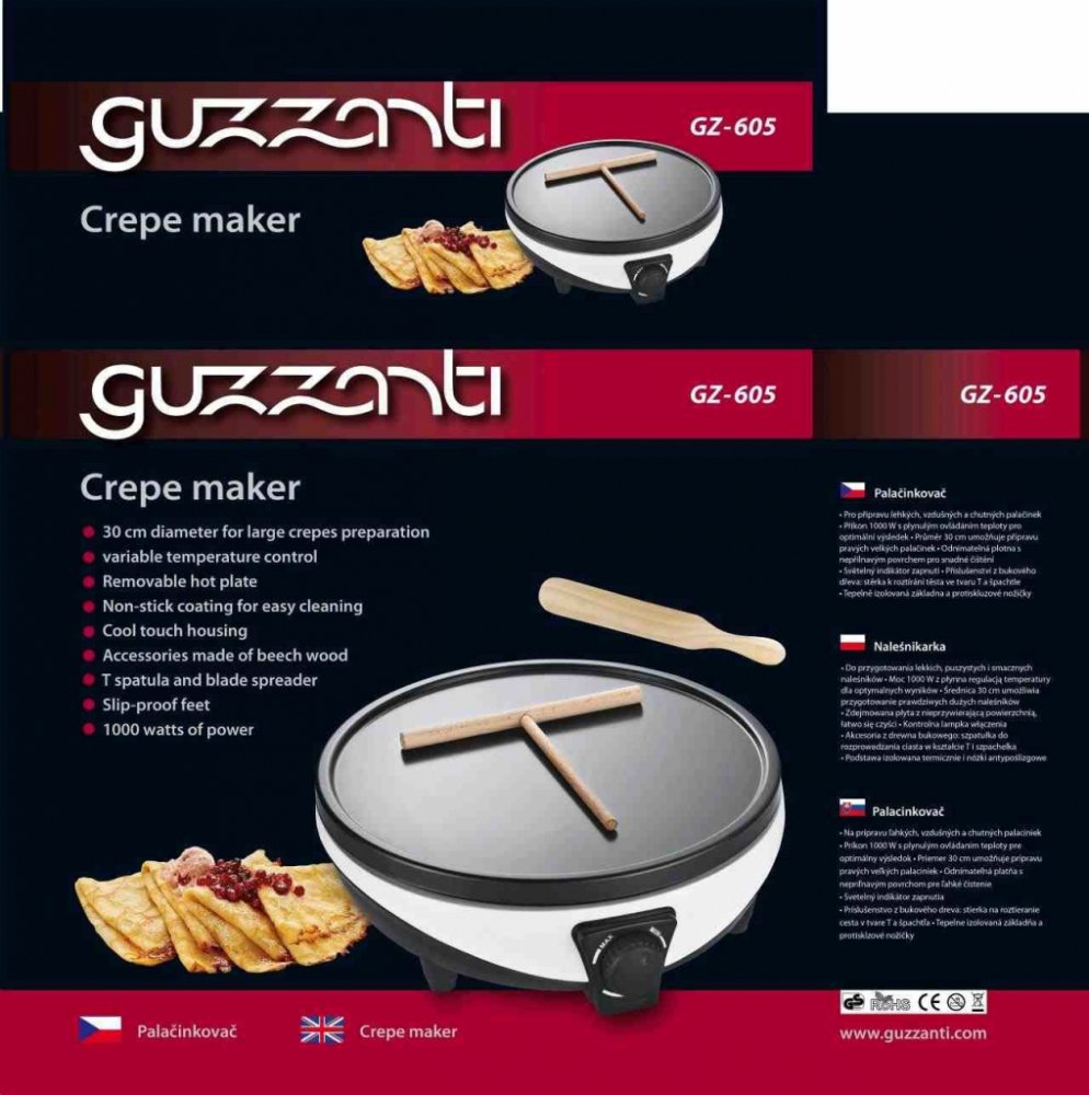 Palačinkovač GUZZANTI GZ 605 má nepřilnavou plotnu s průměrem 30 cm. To umožňuje přípravu opravdu velkých palačinek. Plotna s nepřilnavým povrchem je odnímatelná a velmi snadno se čistí. Základna je tepelně izolovaná. Součástí je dřevěná špachtle k obracení palačinek a dřevěná stěrka pro snadné roztírání těsta na plotně.