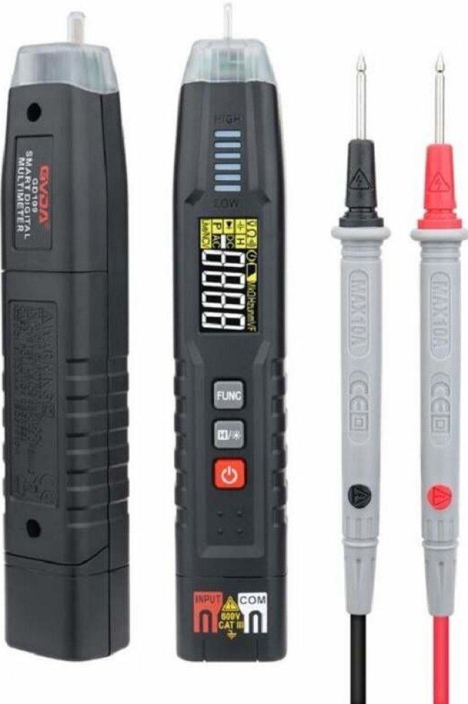 GVDA GD109 - je inteligentní multimetr kapesního typu pera s reálným RMS. Automaticky identifikuje stejnosměrné napětí / ac napětí / odpor a měří bez nutnosti otáčet číselník, snadno ovladatelný. Je vybaven stabilním výkonem, vysokou přesností, automatickým vypnutím po 15 minové nečinnosti pro úsporu energie, měřením kapacity/diody, ochranou proti přetížení, zkouškou kontinuity, bezkontaktním měře...