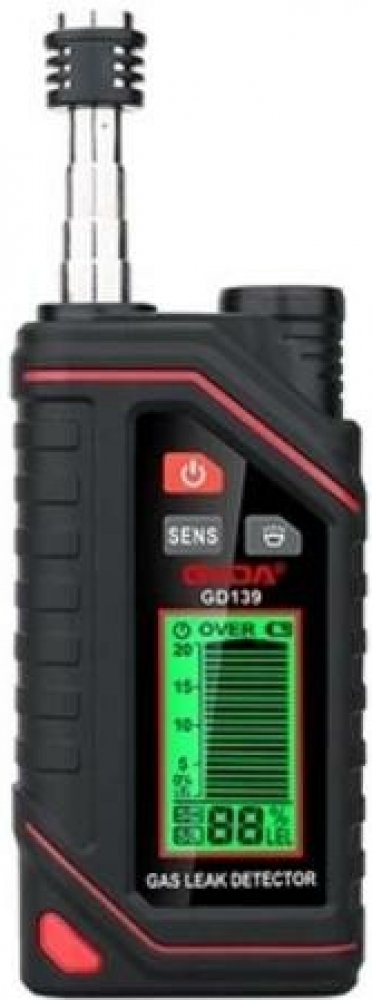 GVDA GD139 Detektor úniku zemního plynu s 12palcovou vysouvací sondou a vestavěnou baterkou. Detekuje plyny: aceton, acetylen, alkohol, amoniak, benzen, butan, ethanol, oxiran, benzin, hexan, vodík, metan, nafta, zemní plyn, ředidla, propan, rozpouštědla atd. Citlivost reakcí: Přibl. 1 % LEL (100 ppm) (methan). 3.7V Lithiová baterie, napájení prostřednictvím portu USB Type C.