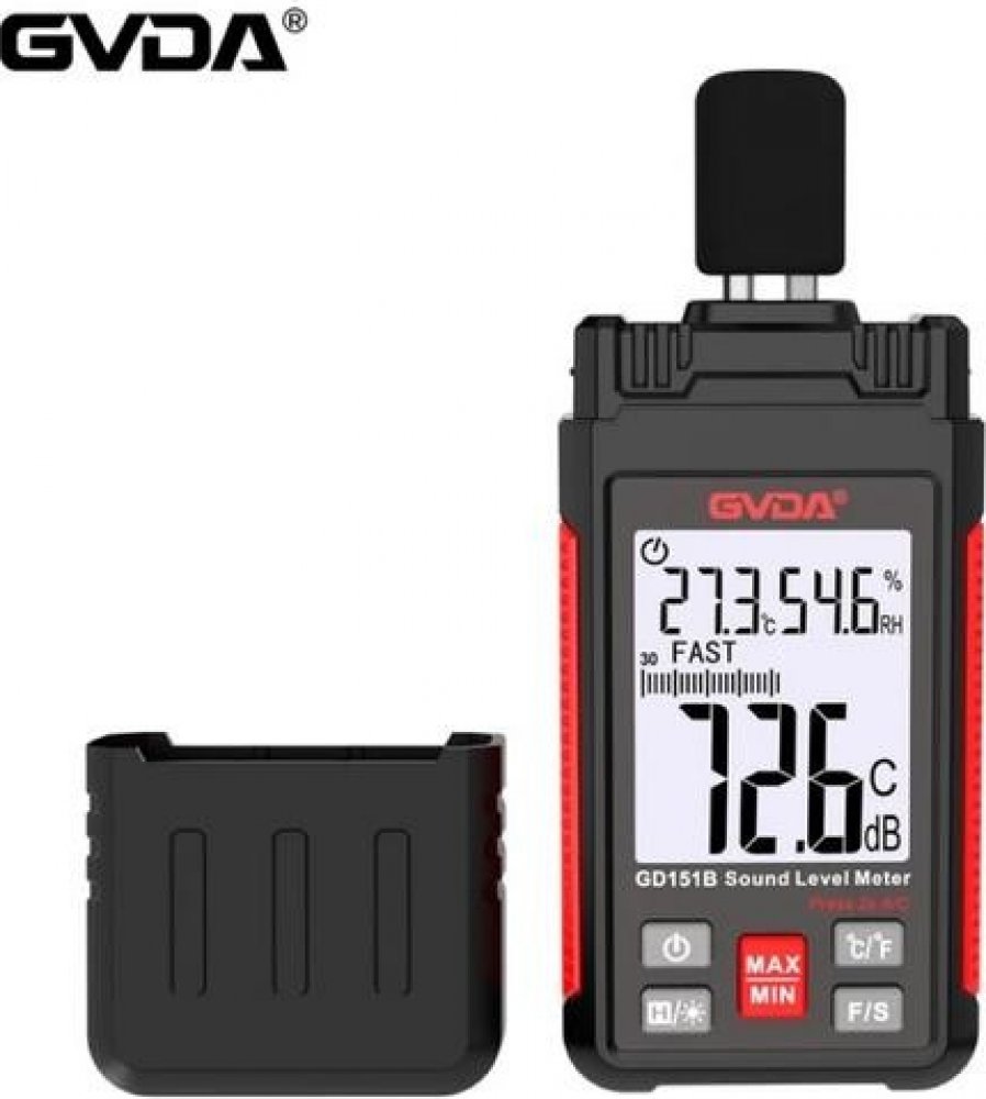 GVDA GD151B, Digitální měřič hluku - Tento zvukoměr se používá k měření úrovně hluku prostředí, jako je továrna, dílna, škola, bydliště, kancelářská oblast, dopravní cesta, zvuk atp. Je vhodný také pro hlukovou techniku, kontrolu kvality výrobků, zdravotní prevenci a kontrolu atp. Dokáže měřit i okolní teplotu a vlhkost. Měří ve dvou úrovních dBA nebo dBC, (dBA se soustředí převážně na středy a výšky, tedy na to jak zvuk vnímá člověk, při přepnutí na měření dBC se měří celková úroveň tedy is basy a nižšími frekvencemi, které člověk nevnímá až tak intenzivně).
