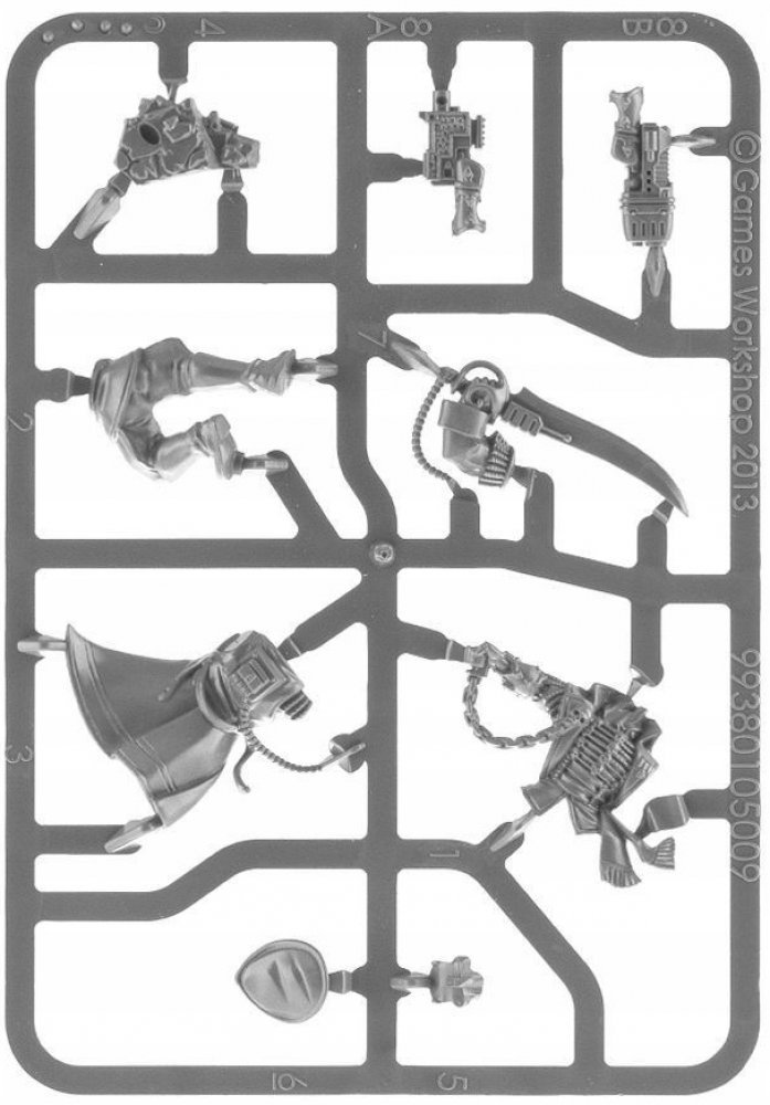 This kit makes one plastic Officio Prefectus Commissar who can be equipped with either a bolt pistol or plasma pistol at the end of his bionic right arm and while his left hand wields a power sword.