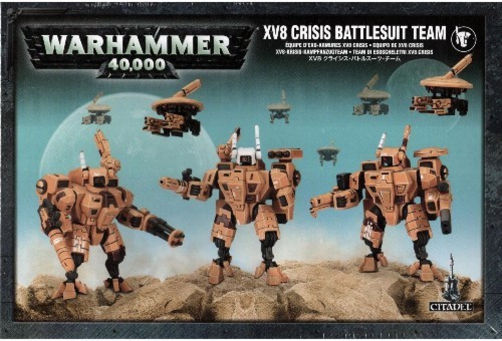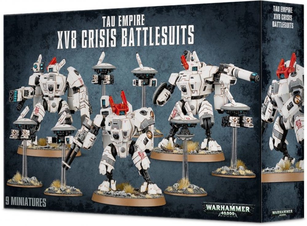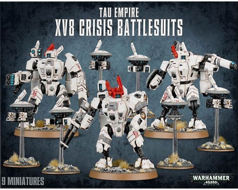 XV8 Crisis Battlesuit je ikonickým ztvárněním technologického pokroku a vynalézavosti T'au. Je radost sledovat battlesuit v bitvě v akci - pokud tedy nejste jeho cílem. Crisis Battlesuits se přibližují k nepřátelům překvapivě rychle na tryskách svých repulzorových motorech. Jakmile se přiblíží tak vystřelí z čeho můžou a následně v mžiku odskáčou pryč. Pilotování mohou být jen těmi nejlepšími T'au...