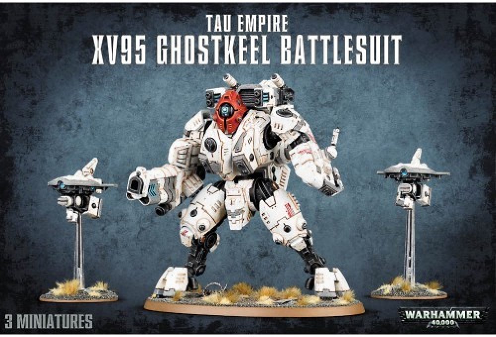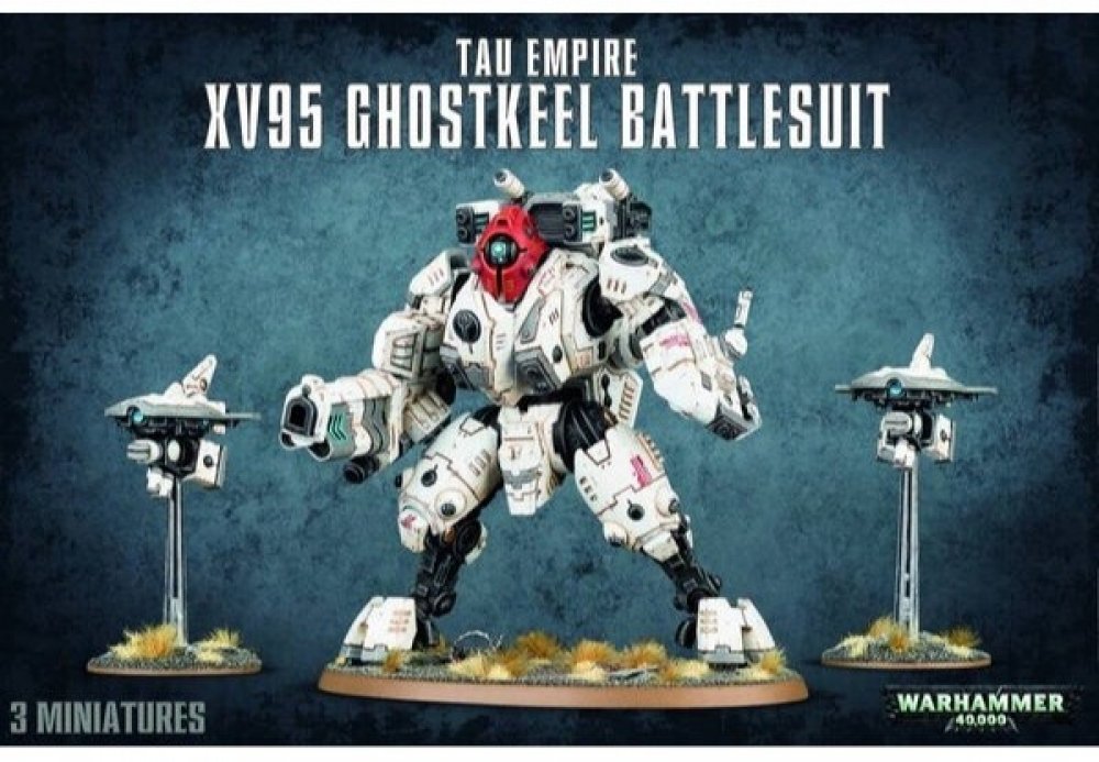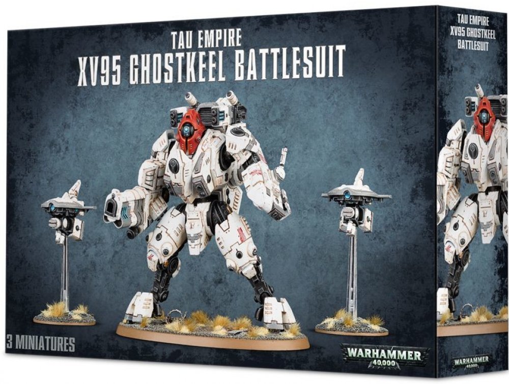 Obrovský, smrtící a téměř nedetokovatelný s působivou schopností zabíjet, takový je XV95 Ghostkeel Battlesuit, oblek jenž je impozantní ukázkou technologií Tau Empire. Pilotovaný jediným vybraným bojovníkem Tau je osamělý Ghostkeel schopen objevit se z nenadání a rozpoutat peklo na bojišti pomocí neuvěřitelné palebné síly. Ve vzniklém chaosu a zmatku bitvy pak dokáže také bezestop zmizet. Tento battlesuit je opatřen širokým spektrem pokročilých protiopatření, což má za následek neviditelnost pro nepřátelské senzory, naváděné zbraně se na oblek nedokáží zacílit a vojákům se díky světelným zábleskům z obleku těžko míří.Tato vícedílná plastová sada vám dává vše potřebné k vybudování jednoho XV Ghostkeel Battlesuit. Tento model má opravdu široké množství možných nastavení díky řadě rukou, nohou, hlav, motorů a trysek a tak je možné model umístit do řady poloh. V balení jsou dvě různé hlavy, hlava suitu může být zvednuto a hrudník otevřený, aby odhalil svého pilota. Kromě toho je v balení obsažena i řada zbraní jako dva Burst Cannons, dva Fusion Blasters, dva plamenomety, jeden Fusion Collider, jedna cyklický Ion Raker a dva XV5 Stealth Drony s polními detektory. Tento suit je vyzbrojen také bodci, ať už pro útok, či obranu. Celkově se v balení nachází 116 dílů s jednou oválnou základnou 105mm.