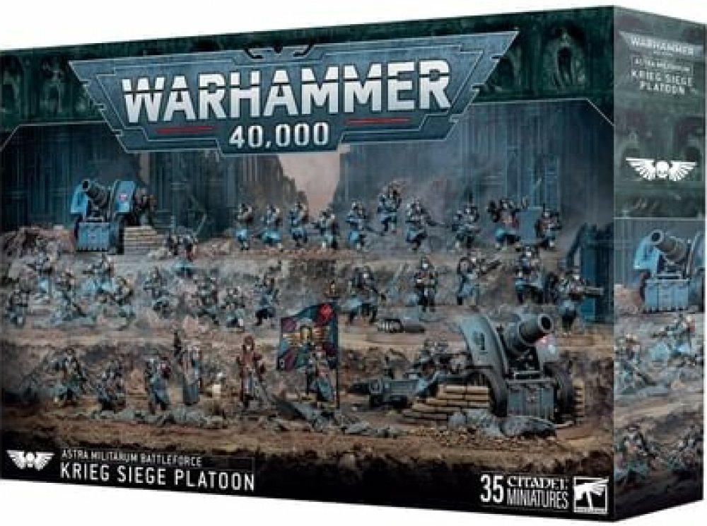 Sada Warhammer 40000: Astra Militarum Battleforce - Krieg Siege Platoon ti poskytne 35 plastových miniatur pěchoty Death Korps of Krieg. Skvělý způsob, jak postavit novou armádu nebo významně posílit už existující vojsko. Miniatury nejsou složené ani nabarvené. Obsah balení: 7x Krieg Command Squad (1x Lord Commissar, 5x Veteran Guardsmen a 1x Servo-scribe) 2x Artillery Teams s variantami výzbroje (siege cannon, multiple rocket launcher, heavy mortar nebo heavy quad launcher) 6x Krieg Combat Engineers (5x Krieg Combat Engineer a 1x Remote Mine) 20x Death Korps of Krieg troopers (možné sestavit jako 2 jednotky po 10 miniaturách) Death Korps of Krieg transfer sheet