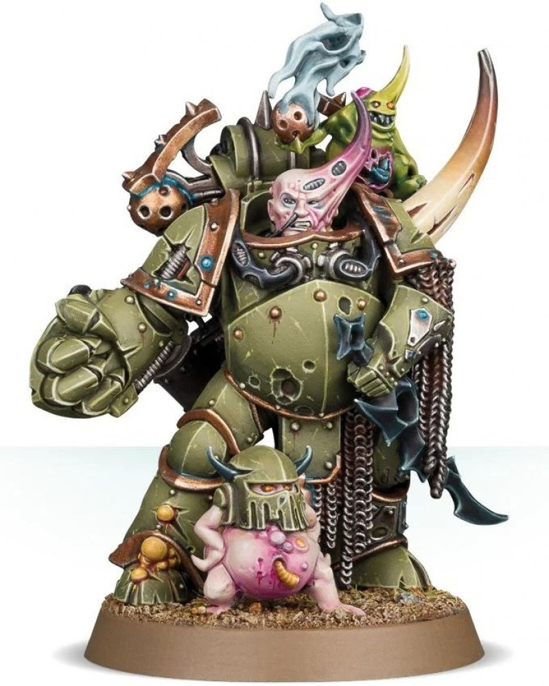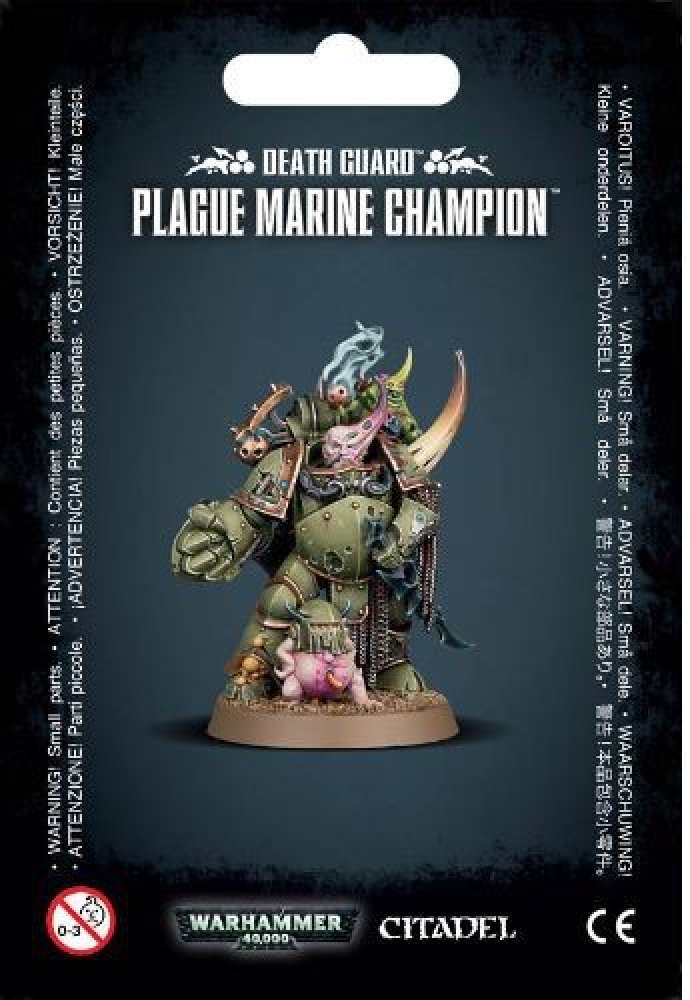This multi-part plastic kit contains the components necessary to assemble a Plague Marine Champion, who can be added to a unit of Plague Marines. Clad in bulging, rusted power armour, he comes with a choice of two variant heads – one helmeted, and one bare (with an unsettlingly large horn growing out of his face…). Befitting his Champion status, he is decked out in chainmail, with a cloak prominently featuring the symbol of Nurgle. He is armed with a plaguesword and power fist, and includes a boltgun which hangs from his backpack. 2 Nurglings are included – one atop his shoulder, clutching a smoking censer, and one optional Nurgling for his base, comically clad in a Death Guard helmet.