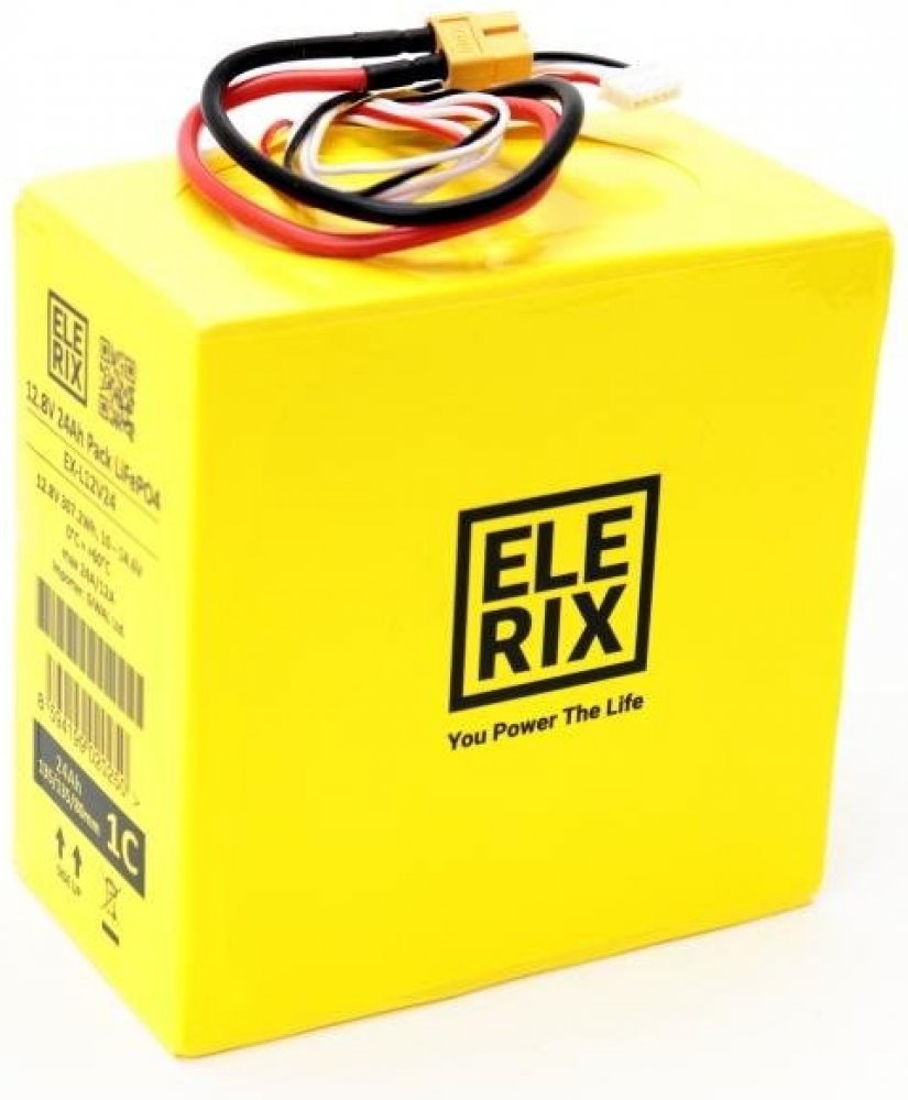 GWL/ELERIX EX-L12V24 Lithiová LiFePO4 baterie ELERIX 12 V (24 Ah) s konektorem XT60 a 5pinovým vyrovnávacím konektorem (balancing). Pro dosažení vyšší kapacity doporučujeme použít články paralelně, tj. 48 Ah (2 články), 72 Ah (3 články), 96 Ah (4 články). Vlastnosti: Technologie lithium-železo-fosfát (LiFePO4) Dlouhá cyklická a univerzální životnost (3000 cyklů a 15 let) Neobsahuje žádné toxické chemikálie Bezpečná technologie bez samovznícení, požáru či možnosti výbuchu Plastové ochranné pouzdro LiFePO4 je velmi bezpečná technologie (bez samovznícení, požáru nebo výbuchu). Míra samovybíjení je velmi nízká a nevzniká paměťový efekt (články lze dobíjet v jakémkoli stavu vybití). Maximální nabíjecí napětí pro počáteční nabíjení: 12,8 V Maximální vybíjecí proud: 1 C Špičkový vybíjecí proud: 48 A (max. 30 s) Hustota energie: 123 Wh/kg Maximální vybíjecí proud: 48 A Optimální vybíjecí proud: 8 A Maximální nabíjecí proud: 48 A Optimální nabíjecí proud: 8 A ZÁKLADNÍ SPECIFIKACE Technologie: lithiová (LiFePO4) Jmenovité napětí: 12,8 V Napětí: 12 V (10 až 14,6 V) Kapacita: 24 Ah (307,2 Wh) Konektory: XT60 (200 mm), 5pin (balancing) Hmotnost: 2,5 kg Rozměry: 135 x 135 x 80 mm
