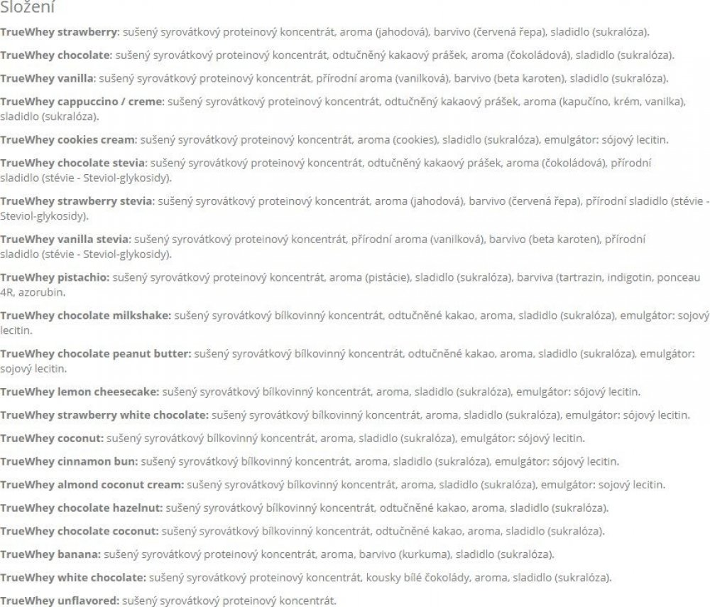 Po rozmíchání s vodou či mlékem True Whey vytvoří lahodný nápoj. Ten je ideální zejména po tréninku k zajištění rychlé regenerace svalů. Můžete jej však užívat i bez návaznosti na sport, a to kdykoli během dne, kdy vám pomůže splnit optimální denní příjem bílkovin. O potřebné proteiny tak obohatí i vaše oblíbená jídla a dezerty. Hodí se například do obilných kaší, smoothies, palačinek zda muffiny. Některé příchutě jsou dokonce slazené pouze stévií. Vybere si tak zkrátka každý, kdo se z jakéhokoli důvodu vyhýbá umělým sladidlům. Úplně bez sladidel a aroma je také varianta bez příchutě. Tato varianta nijak nezmění chuť jídla, díky čemuž je vhodná i do slaných pokrmů, jako je například proteinová pizza.