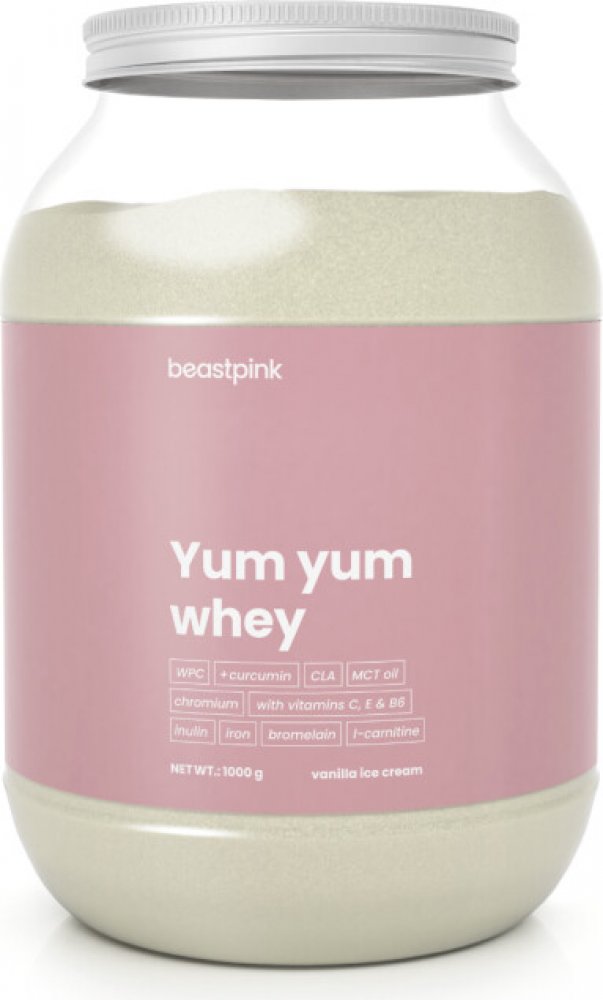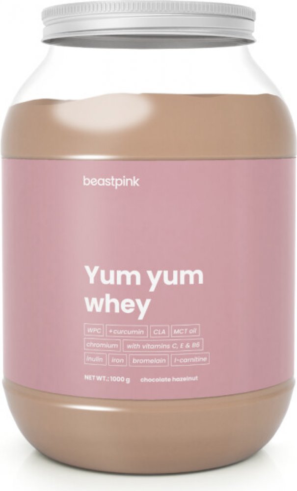 Protein pro ženy GymBeam YUM YUM WHEY PROTEIN 1 KG je syrovátkový protein navržený speciálně pro potřeby aktivních žen. Každá dávka obsahuje minimálně 20 g bílkovin, nízký obsah cukru a funkční látky jako l-karnitin, CLA, MCT olej, inulin a bromelain. Složení je doplněno o vitamíny C, B6, E a minerály hořčík, železo, chrom, které podporují imunitu, hormonální rovnováhu, tvorbu kolagenu a správný energetický metabolismus. Protein je vyroben šetrnou CFM technologií pro zachování vysoké biologické hodnoty. YUM YUM WHEY PROTEIN je vhodný do šejků, kaší i dezertů, snadno se rozpouští a má jemně krémovou konzistenci. Podpořte svůj aktivní životní styl kvalitním proteinem s vyváženým nutričním profilem.