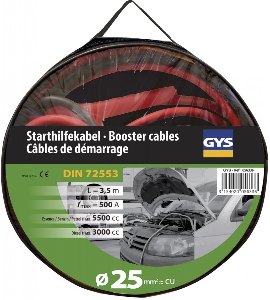 Startovací kabely GYS s maximálním proudem 500 A, průměrem kabelu 25 mm2 a izolovanými svorkami. Startovací kabely jsou vhodné pro automobily s benzínovým motorem o objemu 5,5 l a dieselovým motorem o objemu 3l.