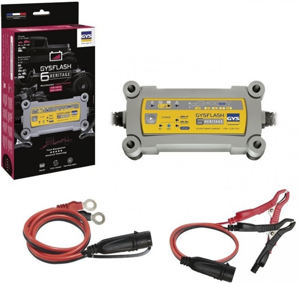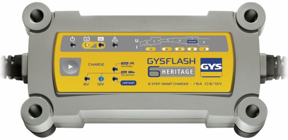 GYSFLASH HERITAGE 6A je vhodná pro moderní automobily i motocykly. 8-kroková inteligentní nabíjecí křívka zaručuje optimální nabíjení všech typů baterií. Speciální režim umožňuje nabíjení 6/12 V baterií s nízkou kapacitou od 1.2 Ah. Nabíječka je tedy vhodná i pro motocyklová a automobilové veterány.