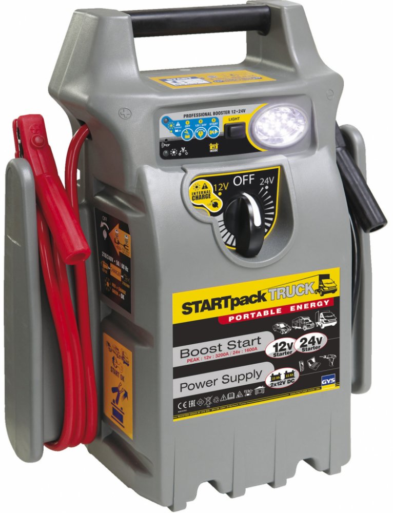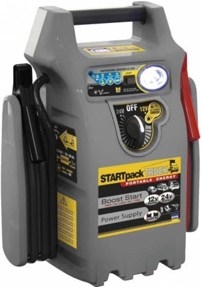 Startovací stanice GYS Startpack TRUCK je velmi výkonný startovací zdroj 12/24 V s integrovanou funkcí zdroje stejnosměrného proudu 12 V a LED osvětlovací lampy. Umožňuje rychlé nastartování motorů vozidel s vybitou baterií, aniž by došlo k poškození elektroniky startovaného vozidla (startovací proud 12 V 750 A, špičkový proud až 2500 A, 24 V 650 A, špičkový proud až 1600 A). Výkonné baterie (2 x ...