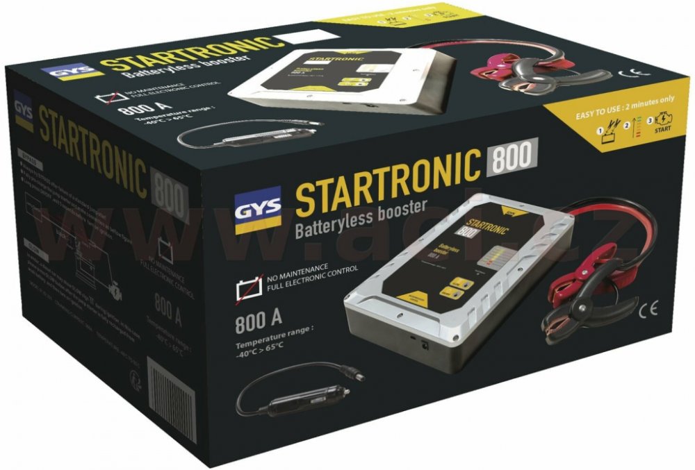Kondenzátorový startovací zdroj GYS Startronic 800 od francouzského výrobce GYS je určen pro vozidla vybavená 12V baterií. Je vybaven "superkondenzátory", které uvolňují energii mnohem rychleji než konvenční baterie. Využívá zbytkové napětí akumulátoru vozidla k dobití a nastartování motoru během několika sekund. Nabíjení je možné ze zásuvky zapalovače ve vozidle, z jiné autobaterie anebo přes USB...