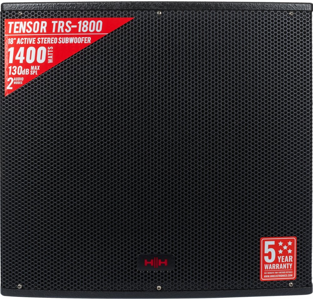 Nový aktivní subwoofer HH TRS-1800 z řady Tensor nabízí robustní špičkový výkon 1400W. Buzení profesionálního 18" reproduktoru HH obstarává vysoce kvalitní zesilovač třídy D. Pro dokonalé sladění s připojenými satelity je TRS-1800 vybaven variabilně nastavitelným dělícím kmitočtem crossoveru a dvěma páry symetrických výstupů. Jedna sada posílá do satelitů full-range signál, zatímco druhá je osazena Hi-pass filtry, které zasílají signál s potlačenými basovými frekvencemi, takže u připojených satelitů nedochází k přetěžování basových reproduktorů. Ve výbavě nechybí tlačítka pro obracení fáze, odzemnění signálu a přednastavené křivky EQ. HH TRS-1800 je vybaven sofistikovanými ochrannými obvody a limiterem. Masivní dřevěný box s odolným černým nástřikem je opatřen ergonomickými madly na bocích.