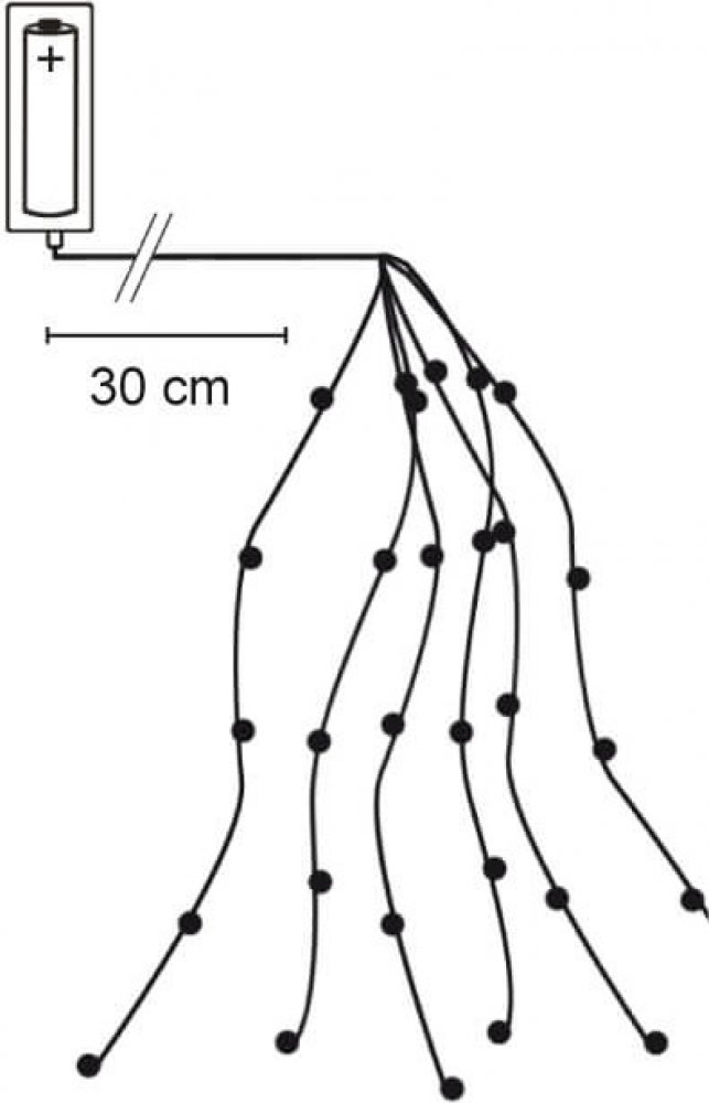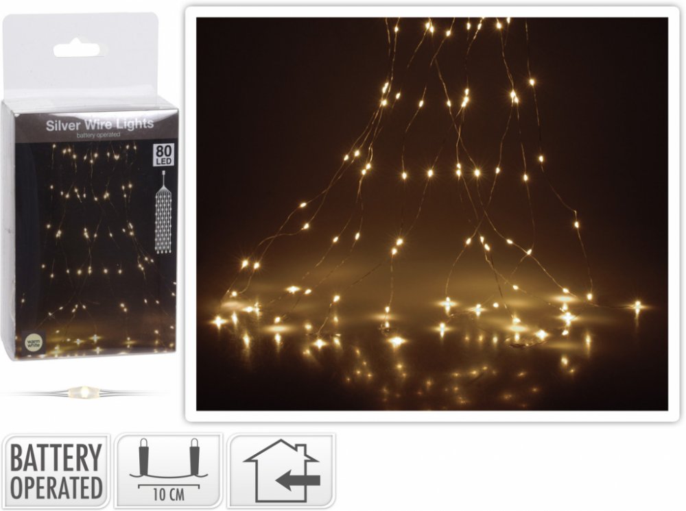 LED svítící vánoční řetěz na vánoční stromeček nebo do okna.Vytvořte si světelný déšť ve svém okně nebo na zdi. Světlo má kouzelnou moc, proměnit každý prostor na výjimečné místo. S LED řetězem vytvoříte vánoční atmosféru jednoduše a elegantně. Celoročně se hodí i pro vytvoření odpočinkového koutu. V dětském pokoji bude LED řetěz vytvářet pocit bezpečí a úkrytu.vnitřní osvětlení80 LEDteplé bílé světlo10 ramen po 8 žárovičkáchvodič 30 cm3 x AA baterie (není součástí balení) Typ produktu:Světelný řetězBarva:Černá, BíláUdálost:VánoceVhodné pro použití uvnitř:AnoPočet LED:80Délka:1,05 mDoporučené pohlaví:Chlapec/děvčeStyl:SoučasnéPodrobnosti o cílové skupině:Dospělý, DětskýPočet kusů v balení:1 kusůŠířka balení:74 mmHloubka balení:38 mmVýška balení:130 mmHmotnost včetně balení:59 g Drátěné klastry LED, 80 teplých bílých LED diod, napájení z bateriíBarva: stříbrná80 teplých bílých LED diodMateriál: drátDesign: drátěný chomáčnapájení z bateriejednotlivě tvarovatelné pramenyprůhledný kabel8 pramenůpro 3 mignonové baterieDélka: 750 mmPřívodní vedení k bateriovému boxu L 30 cm