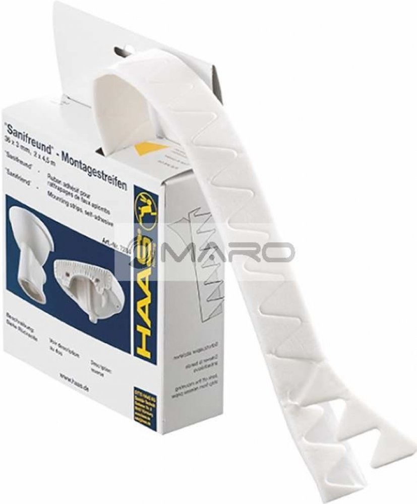 Otto Haas Pás izolační, vyrovnávací pro sanitární keramiku. • jednostranně lepící • k vyrovnání nerovností povrchu u montáží sanitární keramiky na stěnu nebo na podlahu • vhodné pro instalaci umyvadel, poliček, WC, bidetů ... • páska má zoubkový profil, který usnadňuje tvarování dle zařizovacího předmětu • materiál nenasakuje vodu • redukce přenosu zvuku