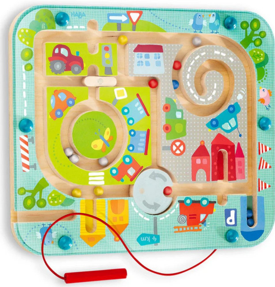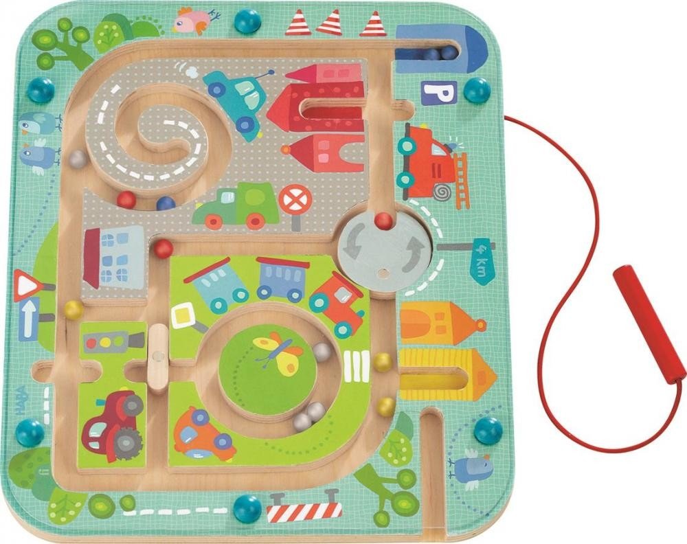Originální dřevěná hračka, kterou doma nemá každé dítě. Úkol je jednoduchý – pomocí magnetické pera vést kuličky napříč labyrintem na místo, kam patří. Zvládne to i prcek.
