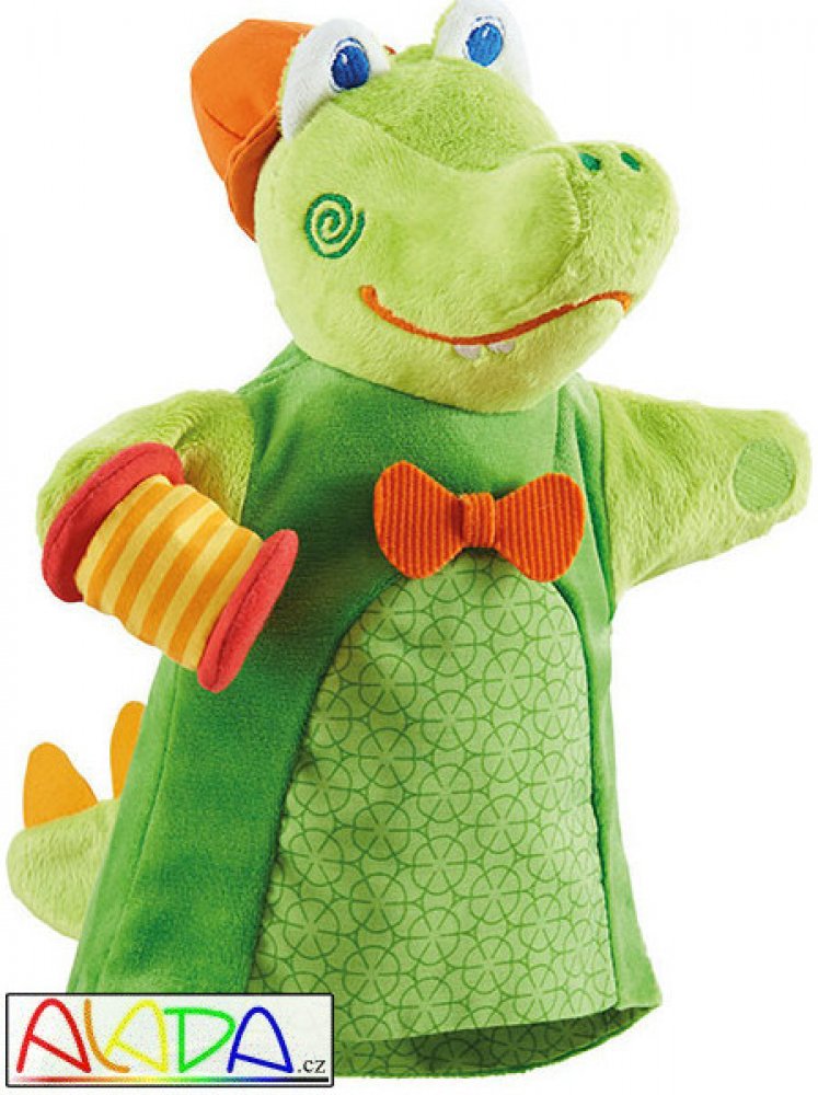 Nejen maňásek, ale také společník pro nejmenší. Krokodýlek má v ruce pískací harmoniku.