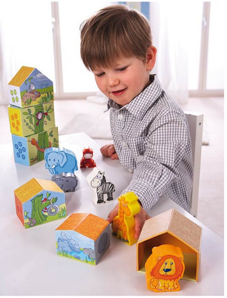 Balení obsahuje: 1 slona, 1 žirafu, 1 zebru, 1 lva, 1 hrocha, 1 opici, 6 kostek (domků pro zvířátka).