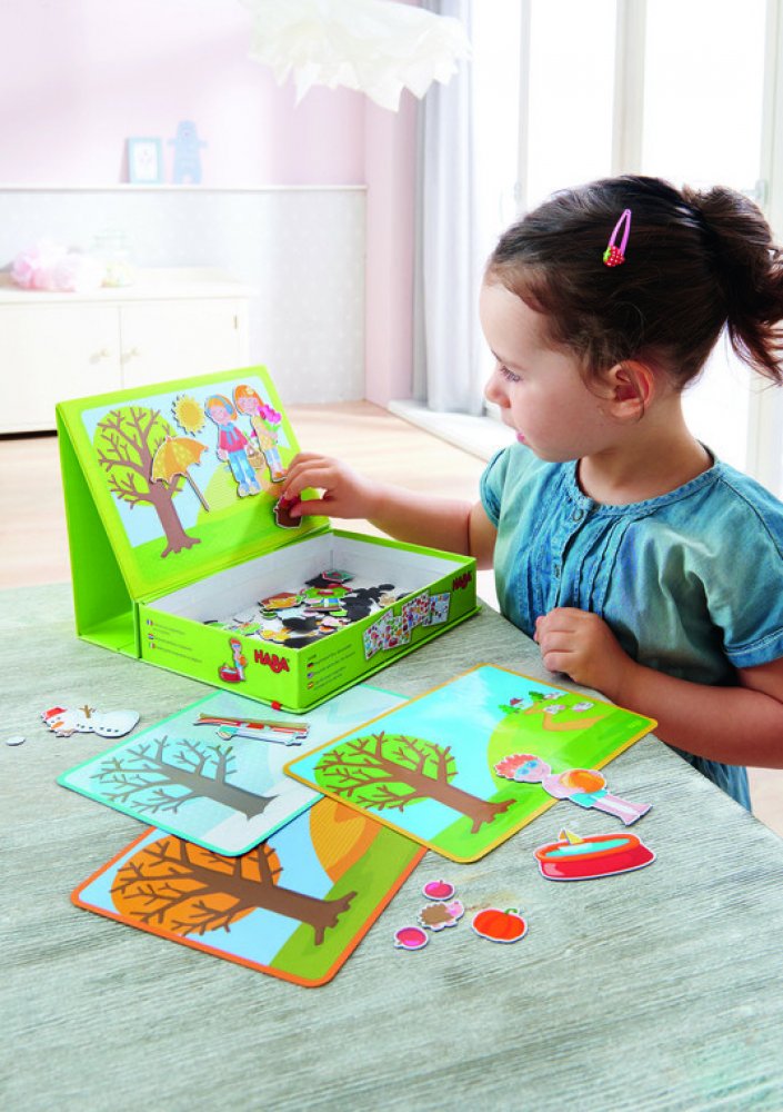 Magnetické puzzle ve formě otevírací kufříku, který si děti mohou brát na cesty do auta. Velmi oblíbená hra, kdy děti mohou tvořit 4 roční období. Přibližuje dětem každé roční období s typickými znaky – jak vypadá počasí na jaře, v létě, na podzim a jak se promění v zimě? Tato hračka procvičuje jemnou motoriku, logické i prostorové myšlení a pěkné obrázky rozvíjí slovní zásobu dětí. Vhodná při výu...
