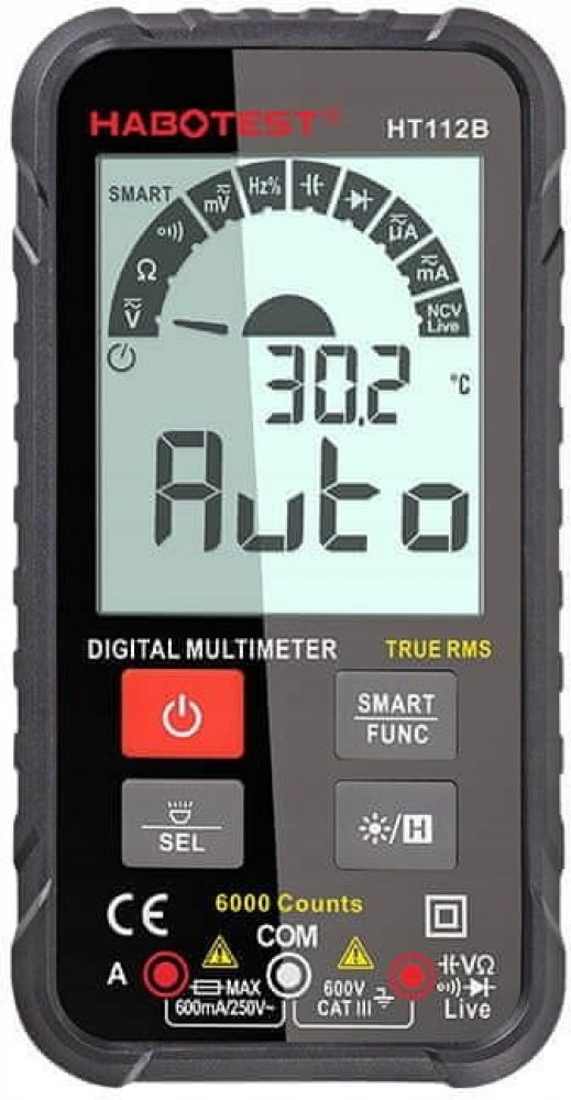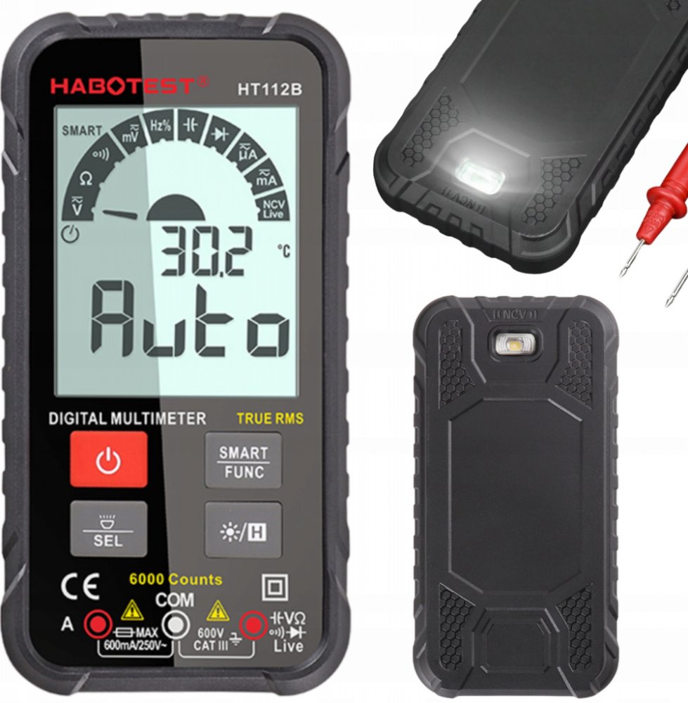 Multimetr značky Habotest vyniká neuvěřitelnou přesností. Přesně měří mimo jiné střídavé a stejnosměrné napětí, odpor a kapacitu. Rozpozná také činnost kabelů. S jeho pomocí můžete testovat diody, kontrolovat spojitost a skutečnou efektivní hodnotu. Umožňuje také bezkontaktní detekci napětí (NCV). HT112B je vybaven inteligentním provozem a automatickou detekcí ACV.