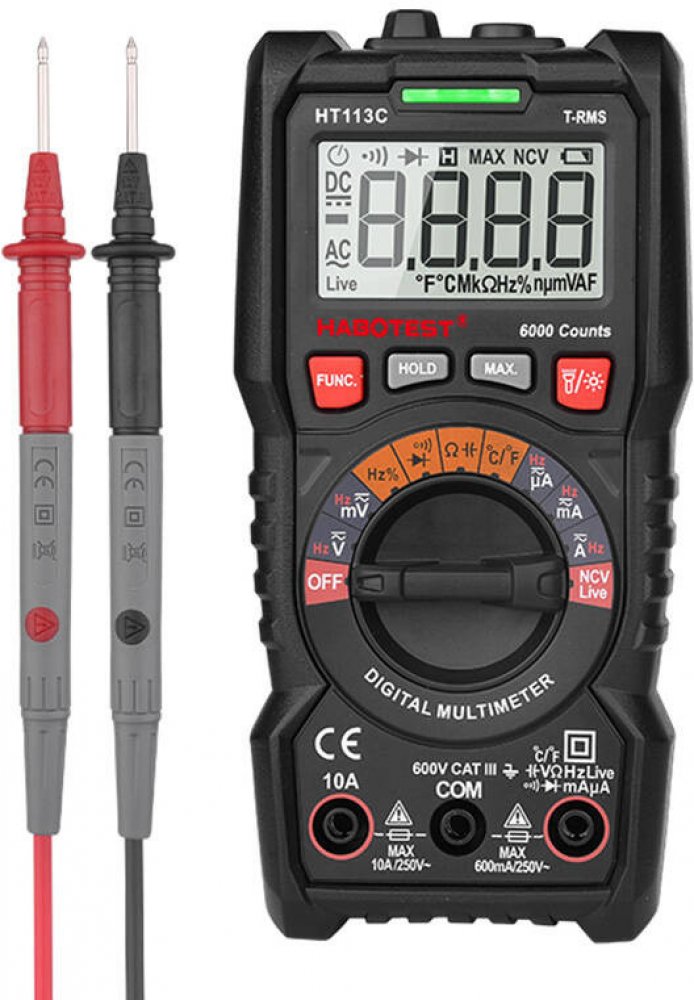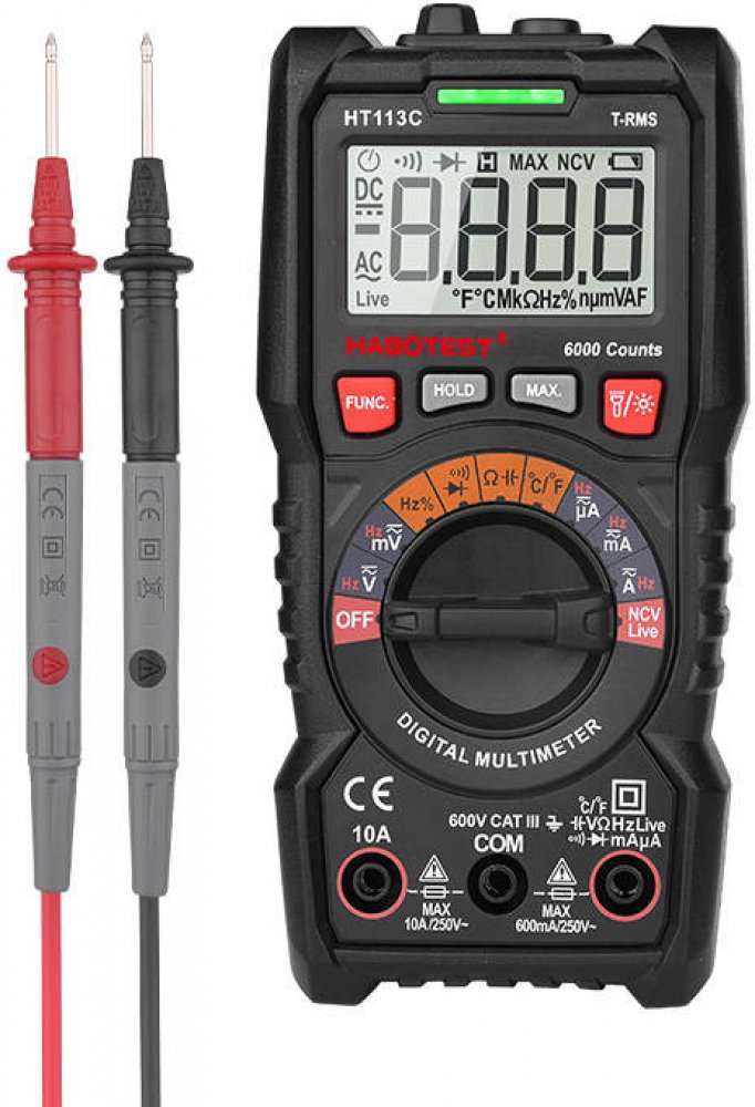 Digitální univerzální multimetr Habotest HT113C nabízí řadu funkcí, které jsou ideální pro kutilské a elektrikářské práce. Přístroj umožňuje měřit stejnosměrné a střídavé napětí, stejnosměrný a střídavý proud a odpor, navíc umožňuje testovat diody a nabízí funkci NCV. Speciální tlačítka vám umožní pohodlně měnit funkce, zatímco přehledný displej poskytuje přístup k potřebným výsledkům. Počet počítadel je 6 000, navíc multimetr umožňuje měření spojitosti, činitele plnění a ukládání dat.